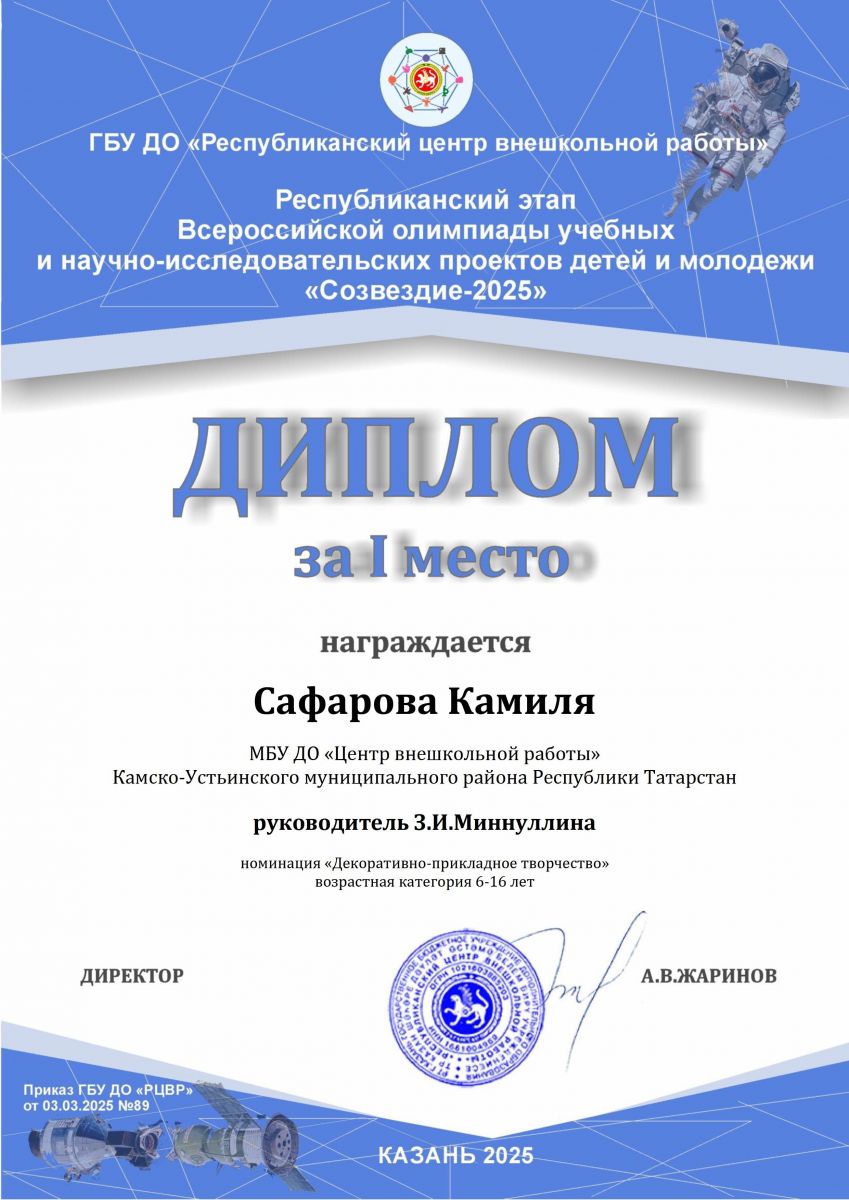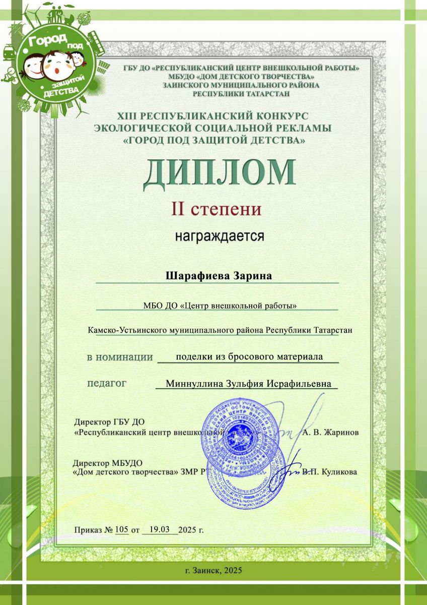 Обучающаяся объединения «Творческая мастерская» Центра внешкольной работы Шарафиева Зарина награждена дипломом 2 степени в номинации «Поделки из бросового материала» Республиканского конкурса социальной рекламы «Город под защитой детства» (педагог Миннуллина З.И.). Поздравляем! Желаем творческих успехов и вдохновения!