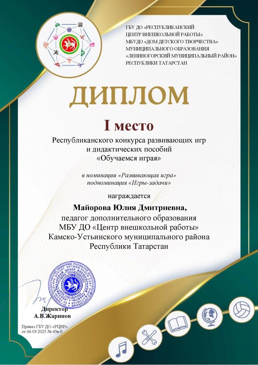 Педагог дополнительного образования Центра внешкольной работы Майорова Юлия Дмитриевна награждена дипломом I степени ГБУ ДО «Республиканский центр внешкольной работы» в Республиканском конкурсе развивающих игр и дидактических пособий «Обучаемся играя» в номинации «Развивающая игра». Поздравляем! Желаем дальнейших успехов!