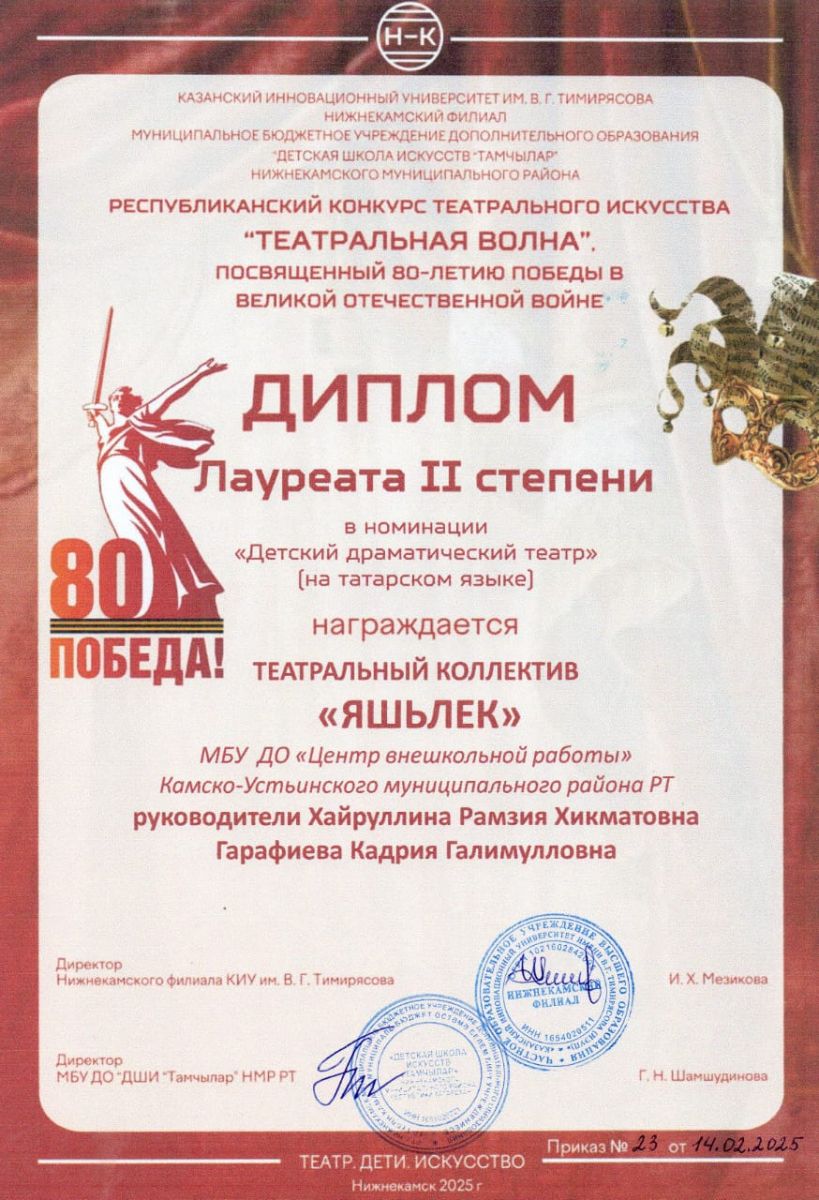 Театральный коллектив «Яшьлек» стал лауреатом II степени в номинации «Детский драматический театр» в Республиканском конкурсе театрального искусства «Театральная волна, посвященном 80-летию Победы в Великой Отечественной войне (руководители Хайруллина Р.Х., Гарафиева К.Г.). Поздравляем! Желаем дальнейших творческих успехов!