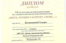 Подведены итоги творческих конкурсов VII Республиканской конференции исследовательских краеведческих работ «Жить, помня о корнях своих…». Бикташева С., учащаяся объединения дополнительного образования «Изобразительное творчество» МБУДО «Центр внешкольной работы», стала лауреатом в конкурсе детских рисунков «Моя малая Родина».