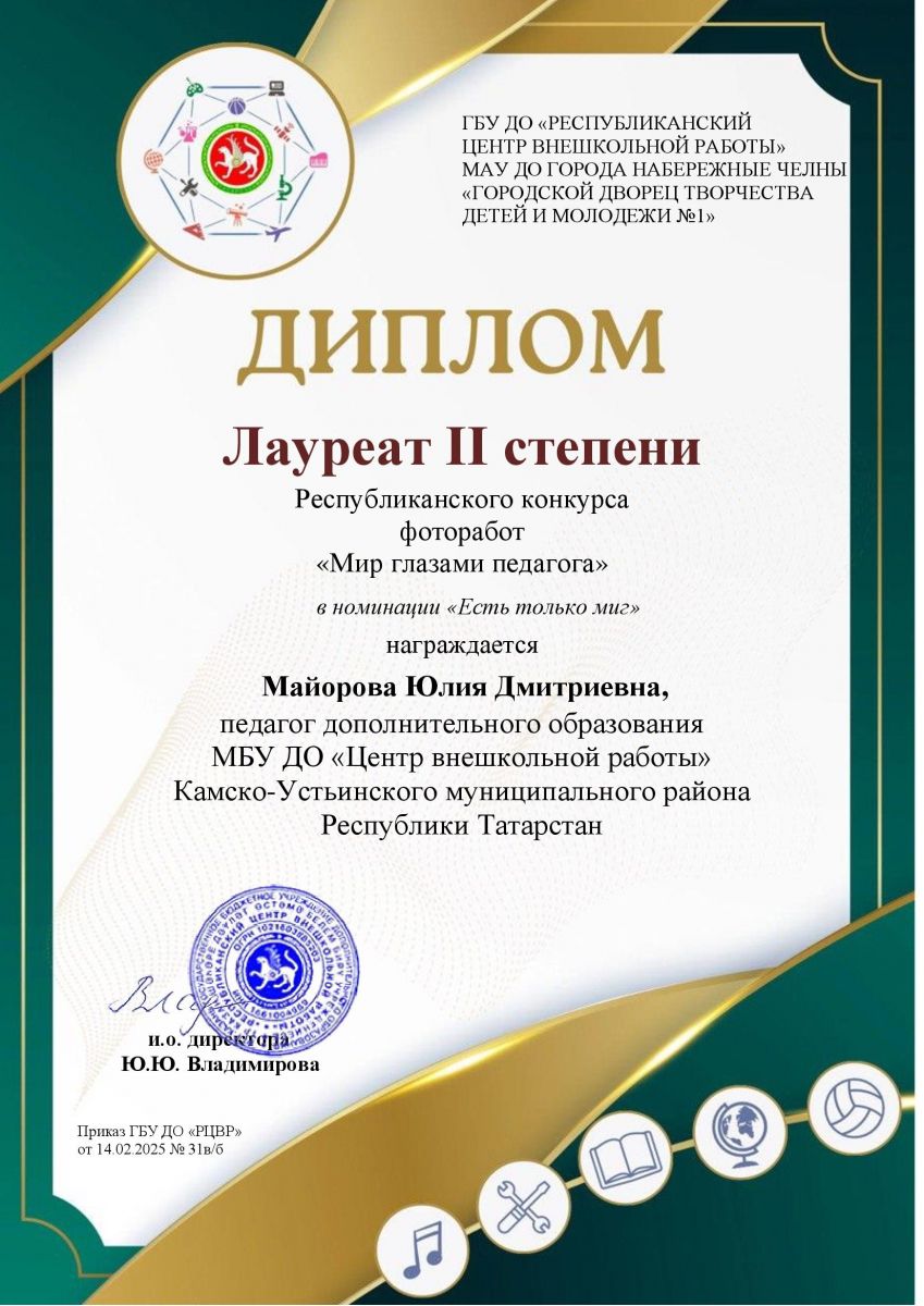 Подведены итоги Республиканского конкурса фоторабот «Мир глазами педагога». Педагог дополнительного образования Центра внешкольной работы Майорова Юлия Дмитриевна в номинации «Есть только миг» стала лауреатом II степени. Поздравляем! Желаем дальнейших творческих успехов!
