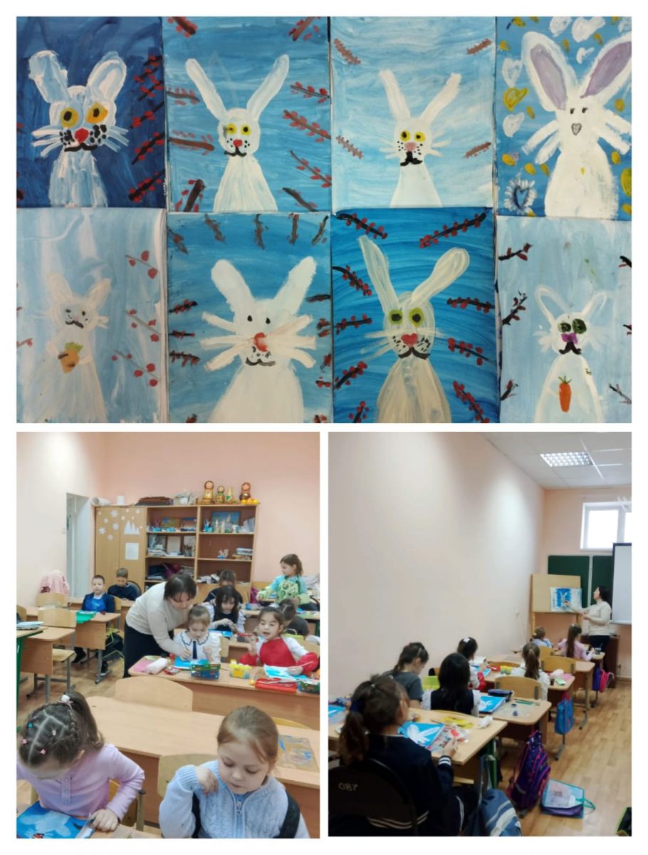 Сегодня обучающиеся объединения «Изобразительное творчество» под руководством педагога дополнительного образования Мингазеевой Г.Р. учились рисовать зайчика. Рисунки получились яркими и красочными. Из выполненных работ была организована выставка «Веселые зайчики».