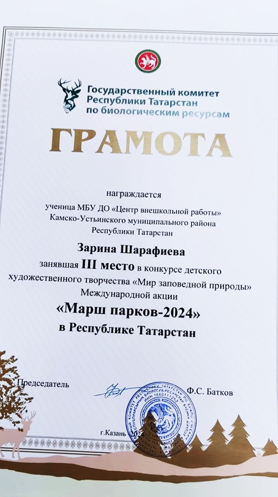 Обучающаяся объединения дополнительного образования «Изобразительное творчество» Шарафиева Зарина заняла 3 место в конкурсе детского художественного творчества «Мир заповедной природы», проводимого в рамках Международной акции «Марш парков – 2024» в Республике Татарстан. Руководитель Мингазеева Г. Р. награждена благодарственным письмом за подготовку призера.
