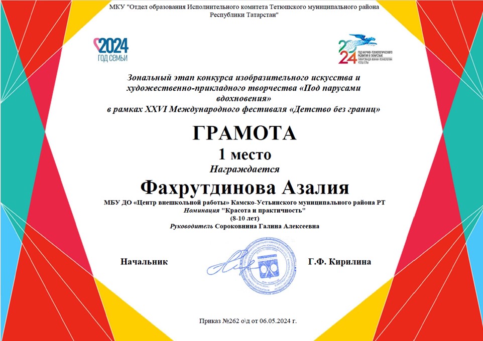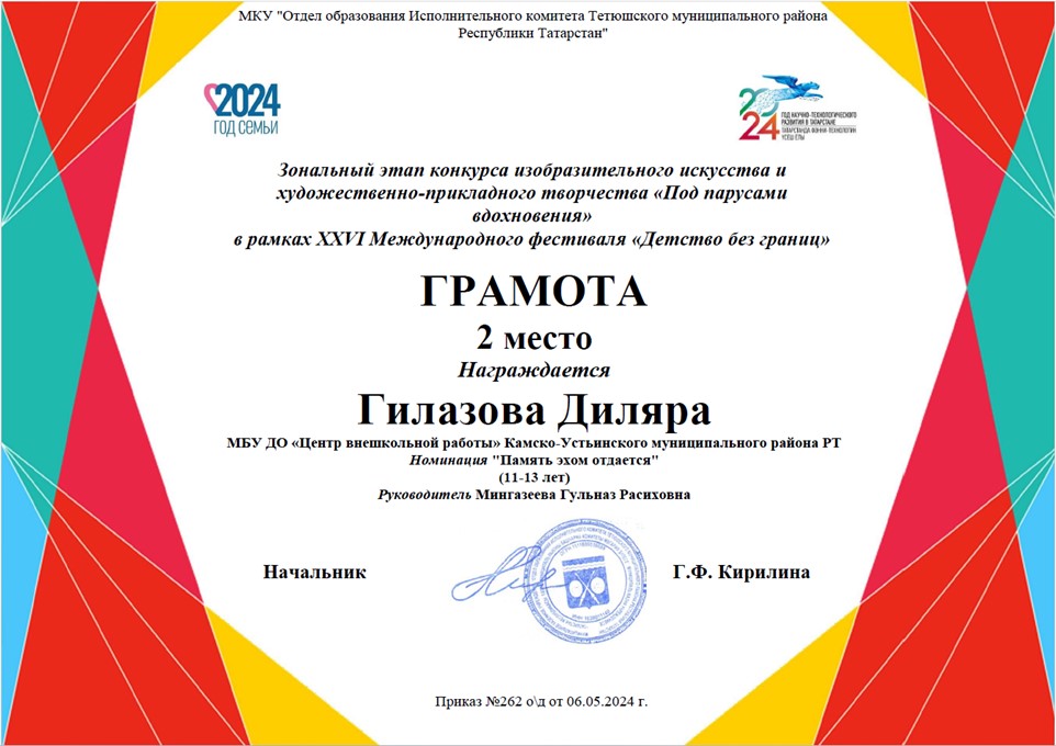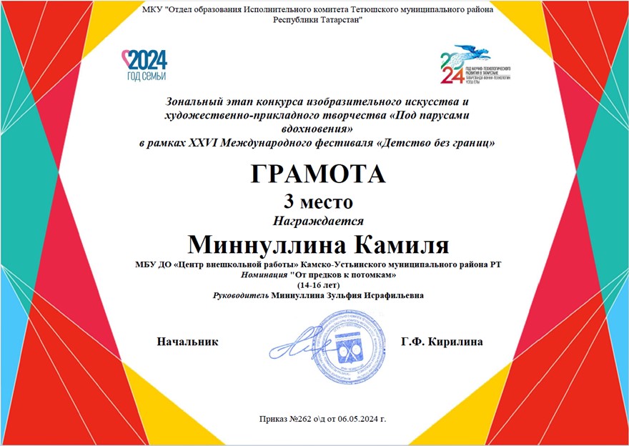 Среди победителей и призеров зонального этапа конкурса изобразительного искусства и художественно-прикладного творчества «Под парусами вдохновения», проводимого в рамках XXVI Международного фестиваля «Детство без границ», есть и обучающиеся МБУДО «Центр внешкольной работы». Фахрутдинова Азалия стала победителем в номинации «Красота и практичность», руководитель Сороковнина Г. А.. Гилазова Диляра заняла 2 место в номинации «Память эхом отдается», у Шакировой Дилии 3 место в номинации «Дыхание кисти», руководитель Мингазеева Г. Р.. Миннуллина Камиля заняла 3 место в номинации «От предков к потомкам», руководитель Миннуллина З. И.