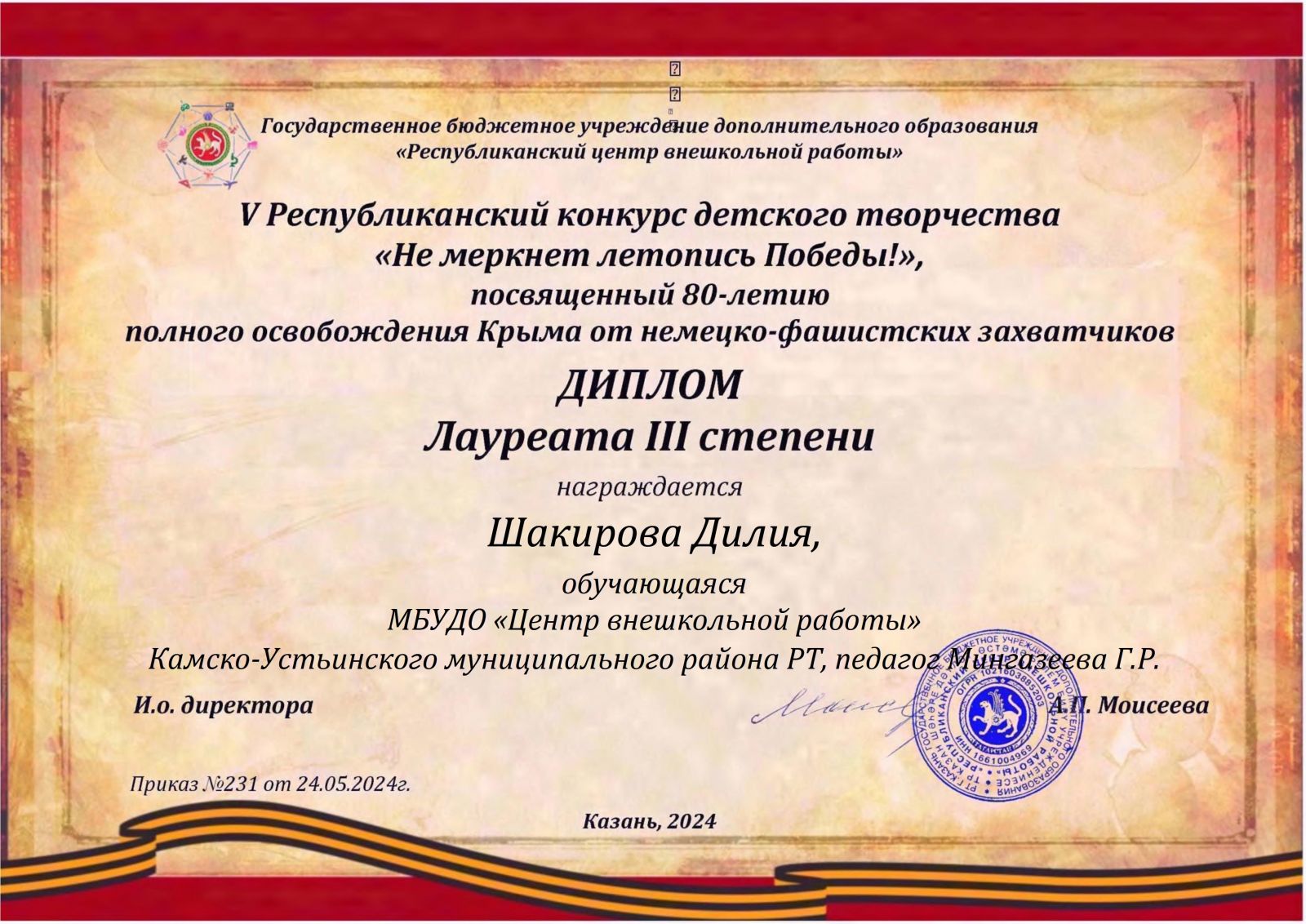 Обучающаяся объединения дополнительного образования «Изобразительное творчество» Шакирова Дилия награждена дипломом лауреата III степени V Республиканского конкурса детского творчества «Не меркнет летопись Победы!», руководитель Мингазеева Г. Р.