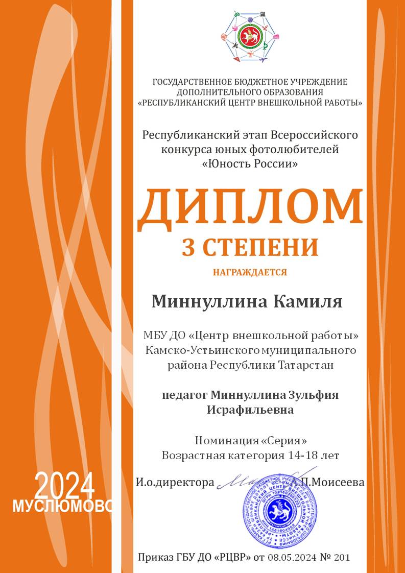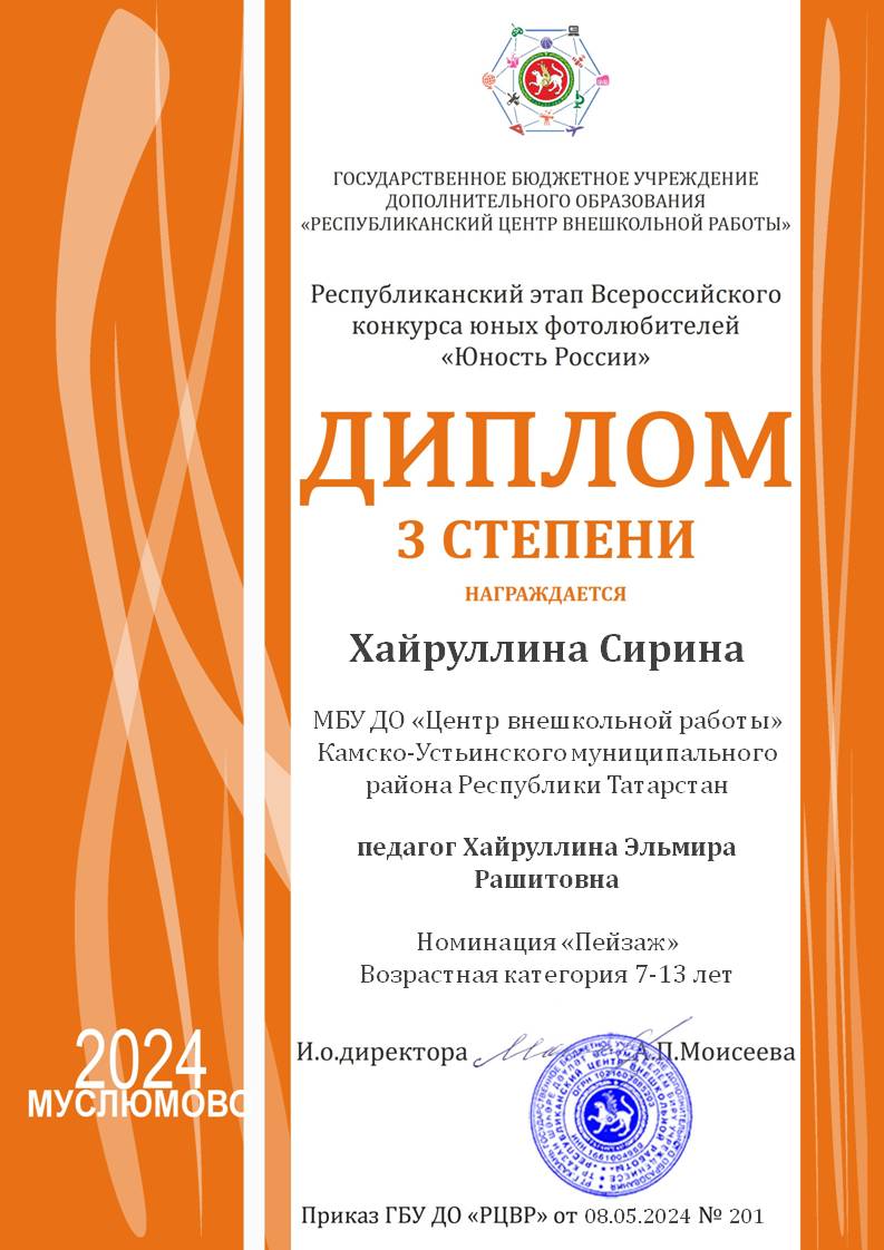 Обучающиеся МБУДО «Центр внешкольной работы» Миннуллина Камиля (руководитель Миннуллина З. И.) и Хайруллина Сирина (руководитель Хайруллина Э. Р.) заняли 3 место в Республиканском этапе Всероссийского конкурса юных фотолюбителей «Юность России».