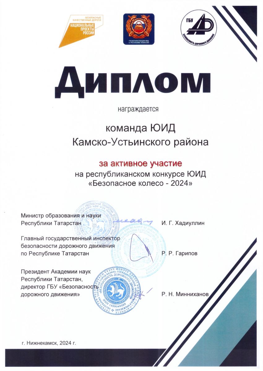 Диплом участника республиканского конкурса ЮИД «Безопасное колесо – 2024»