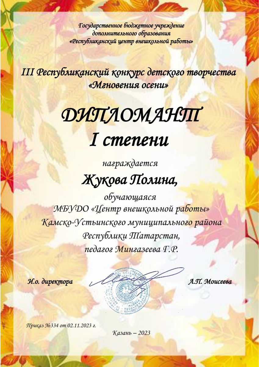 Мокшина Ксения лауреат 1 степени III Республиканского конкурса детского творчества «Мгновения осени»
