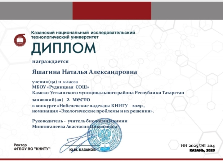 Яшагина Наталья - 2 место в Республиканском конкурсе "Нобелевские надежды КНИТУ - 2025"
