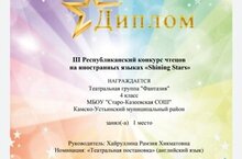 I место в III Республиканском конкурсе чтецов на иностранных языках "Shining Stars", номинация:"Театральная постановка"(английский язык), заняла театральная группа "Фантазия". Руководитель: Хайруллина Р. Х. Поздравляем! Желаем дальнейших успехов!