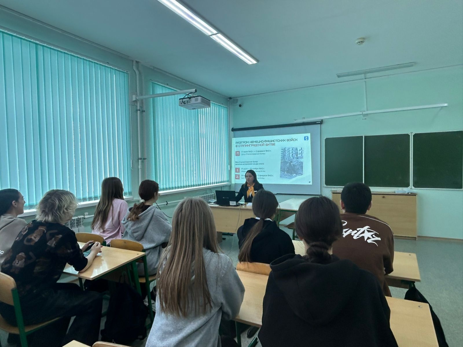 Советник директора по воспитанию Гимадиева Г.К. провела познавательную лекцию для учащихся на тему «История Великой Победы. Победа над немецко-фашистскими войсками в Сталинграде». Лекция была организована Российским обществом «Знание».