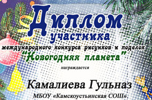 Дипломами международного конкурса рисунков и поделок «Новогодняя планета» награждены Камалиева Г.(11б класс), Мухамадиева Л.(6а класс), Халикова В.(5б класс).Руководитель- Мингалиева А.Ф.