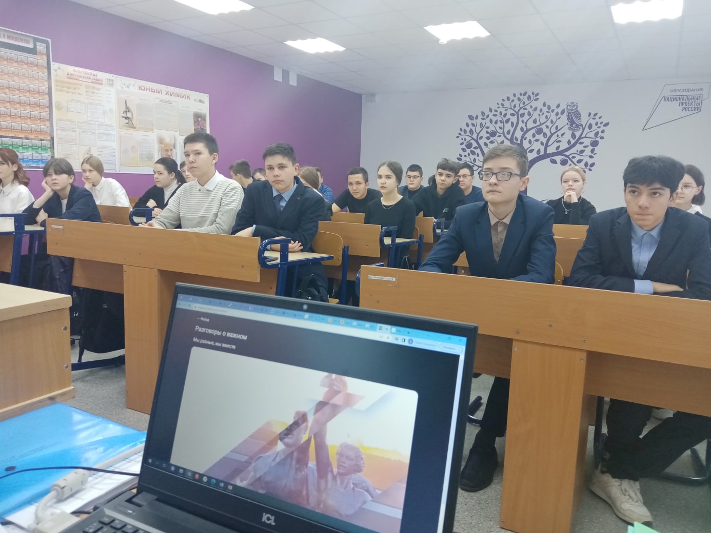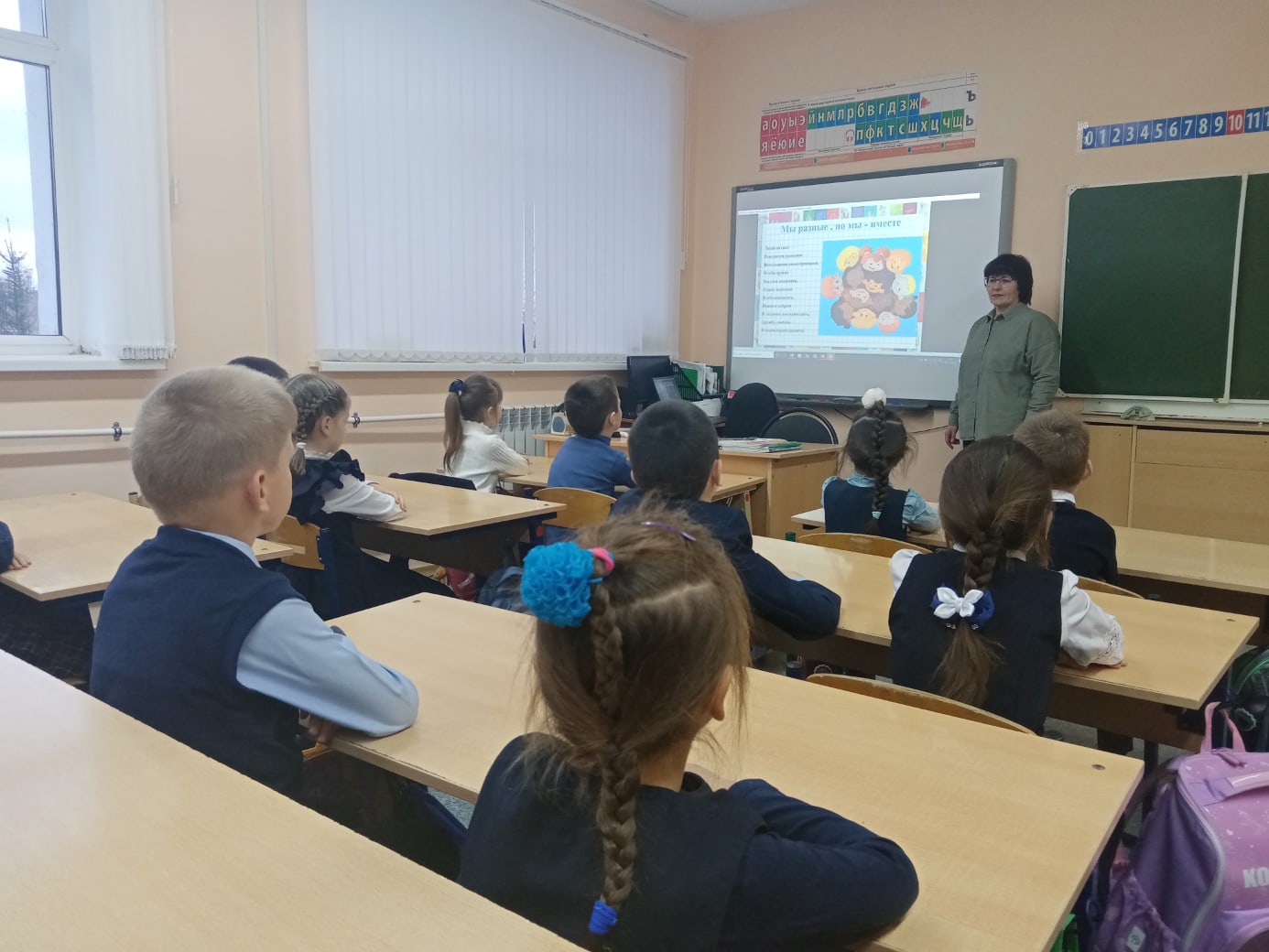14 ноябрьдә мәктәптә «мөһим нәрсәләр турында сөйләшүләр»дигән дәрестән тыш дәрестән тыш дәрес булды. Эшчәнлекнең темасы: "Без төрле, Без бергә.» Илебез территориясендә 190 нан артык милләт вәкилләре яши. Без бик төрле, ләкин гасырлар дәвамында бергә яшибез, өйрәнәбез һәм эшлибез, бер-беребезне яхшы аңлыйбыз һәм туплыйбыз. Бүгенге дәрес Россия Федерациясе халыкларының рус теленә һәм туган телләренә багышланган иде. Билгеле булганча, кешеләр туган телләрендә сөйләшүне, язуны һәм укуны туктатсалар, телләр юкка чыгарга мөмкин. Россия Федерациясе халыкларының туган телләрен, туган телләрне саклау өчен мәктәпләрдә өйрәнәләр, туган телләрдә газета-журналлар чыгаралар, конкурслар һәм фестивальләр уза, үз халкының мәдәниятен саклап калалар. Бүгенге дәрестән балалар илебезнең күп санлы халыкларының телләре һәм мәдәнияте, Россиянең аларның төрлелеген саклап калуы турында күп нәрсә белделәр.