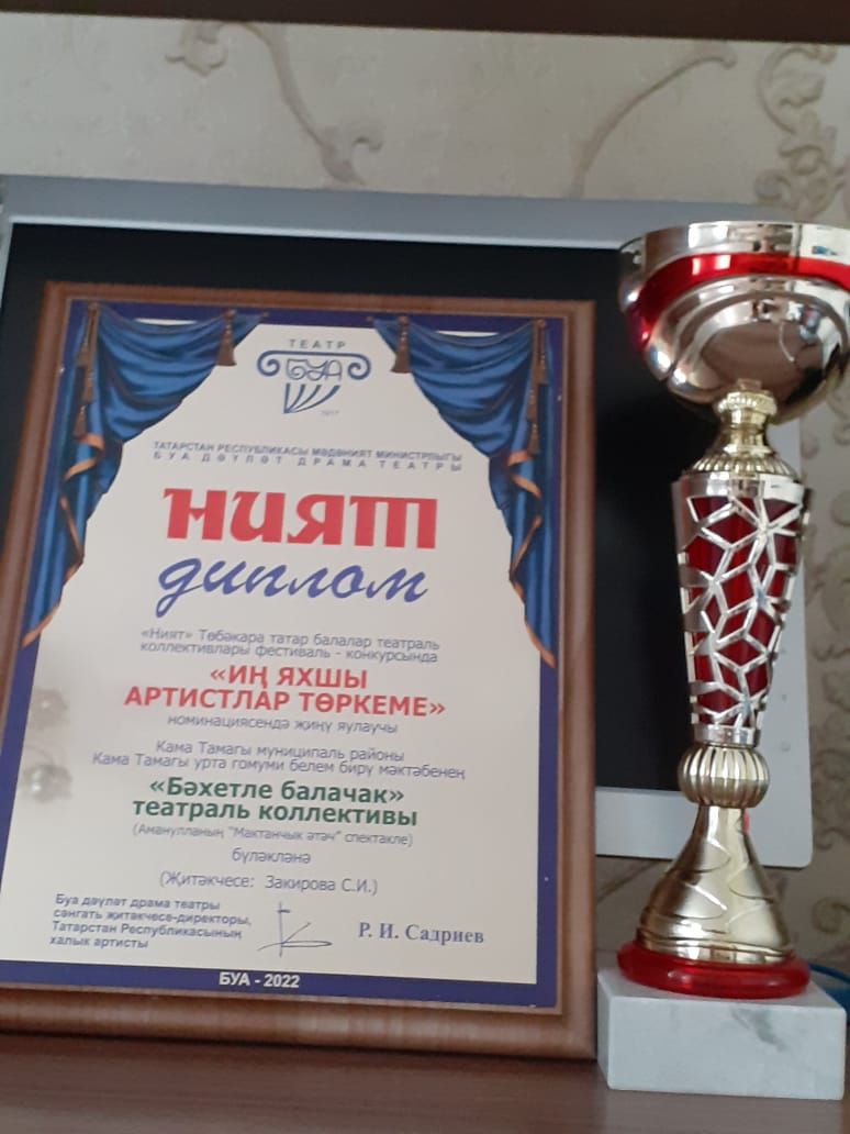 7 сентябрьдә Буа дәүләт драма театрында "Ният" Төбәкара татар балалар-яшүсмерләр театр коллективлары фестиваль-конкурсында җиңүчеләрне бүләкләү тантанасы булды. Чарада Кама Тамагы мәктәбенең өч театр коллективы: кече һәм өлкән "Счастливое детство" төркеме (җитәкчесе Закирова С.И.), "Зеркало сцены" (җитәкчесе Исмәгыйлова Г.Р.) актив катнашканы өчен диплом белән бүләкләнделәр. "Бәхетле балачак" театр коллективының кече төркеме "Иң яхшы артистлар" номинациясендә җиңүче булды.