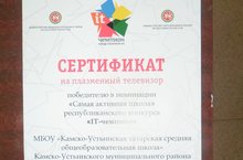 Наша школа стала победителем в номинации "Самая активная школа" республиканского конкурса "IT-чемпион". В качестве ценного приза мы получили плазменный телевизор! Поздравляем!