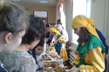 Сегодня прошла школьная ярмарка. Дети активно приняли участие: принесли всё, что можно продать (выпечку, сладости, вещи, сделанные своими руками). Продавцы были одеты в национальные костюмы. Играла музыка, раздавали бесплатные напитки. Всем очень понравилось.