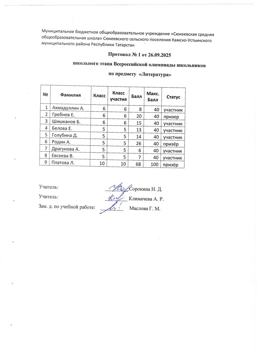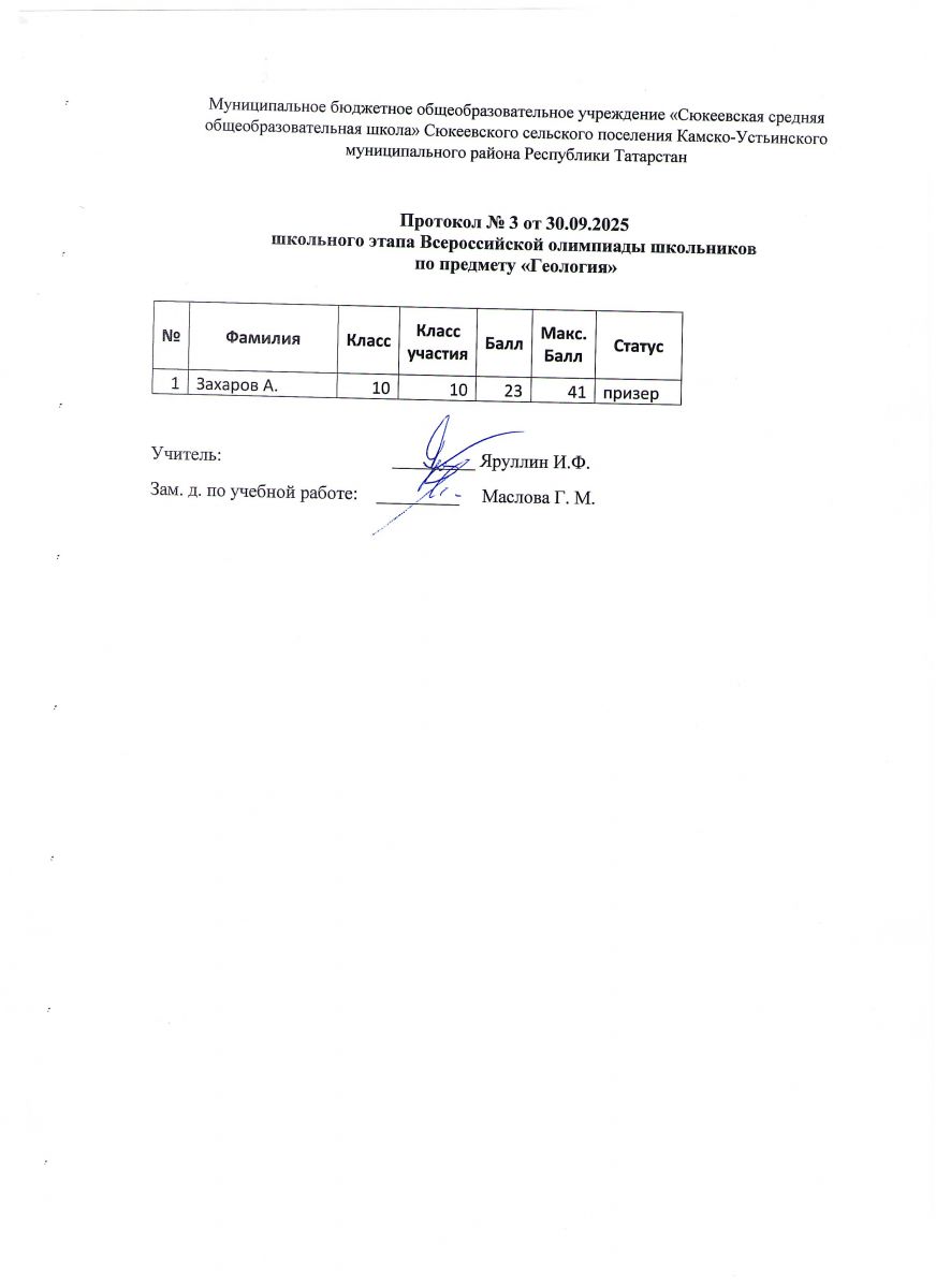 1) Протоколы школьного этапа Всероссийской олимпиады школьников по предмету: