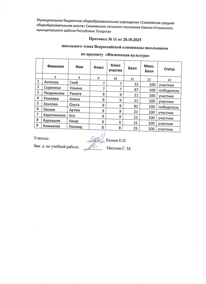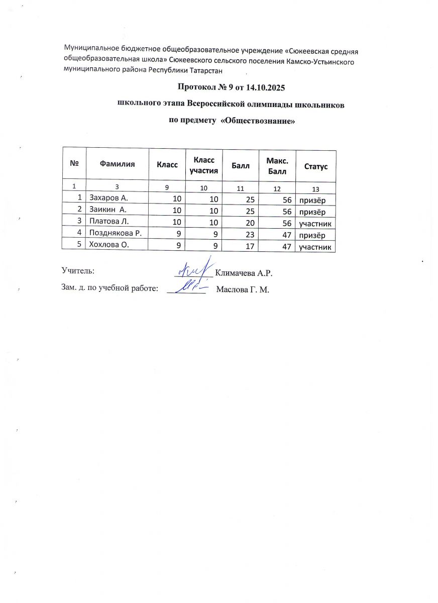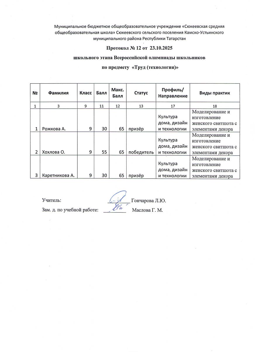 1) Протоколы школьного этапа Всероссийской олимпиады школьников по предмету: