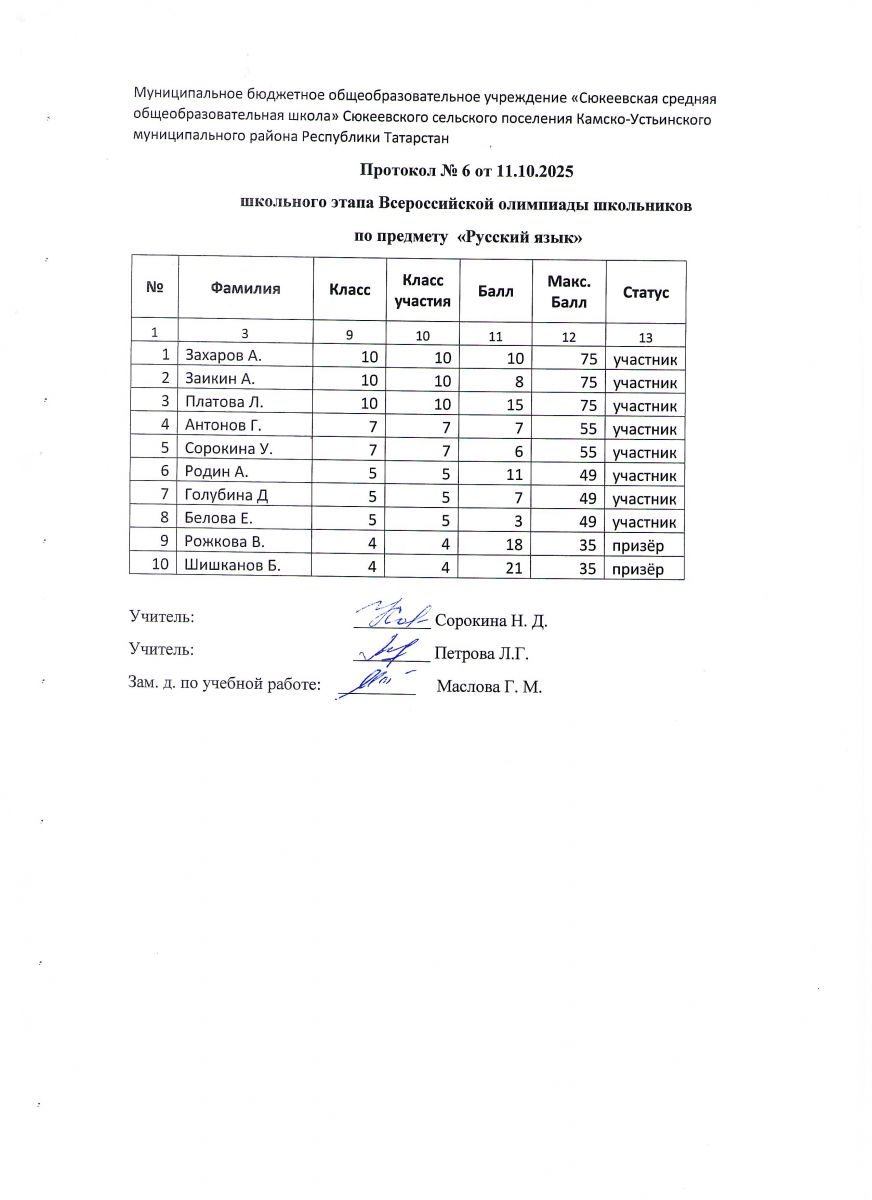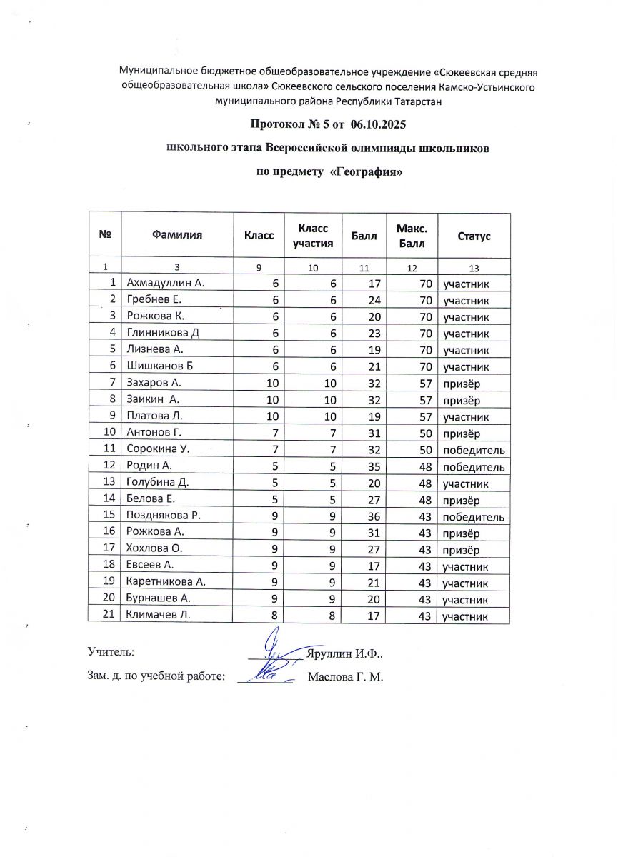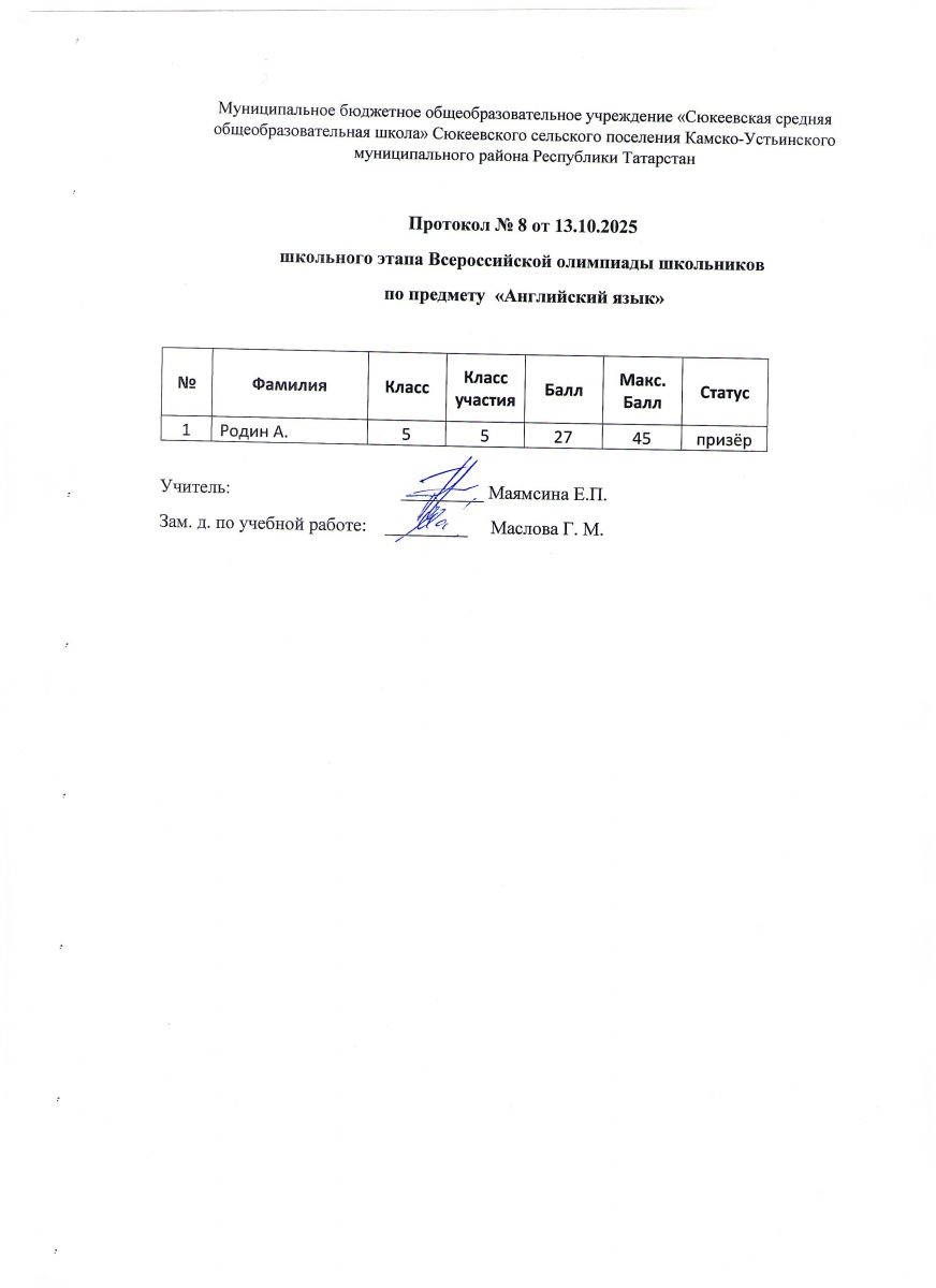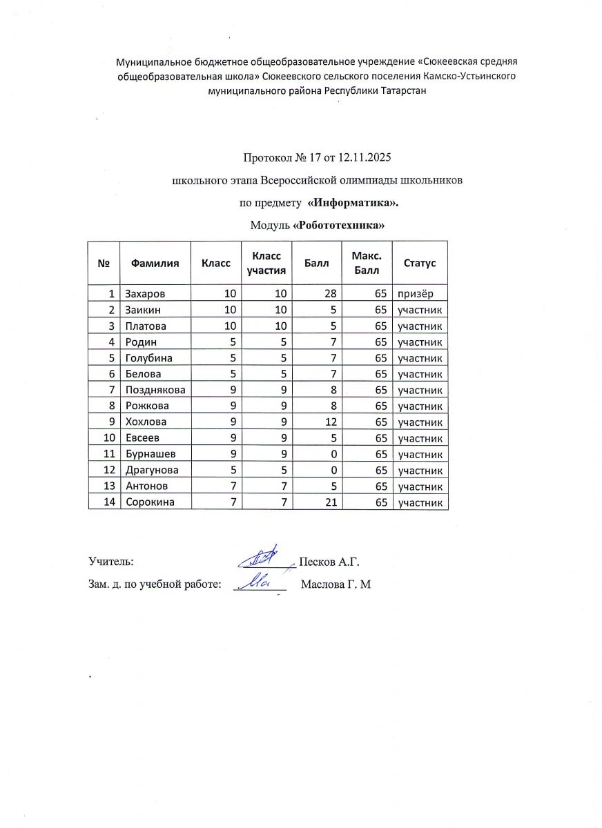 1) Протоколы школьного этапа Всероссийской олимпиады школьников по предмету: