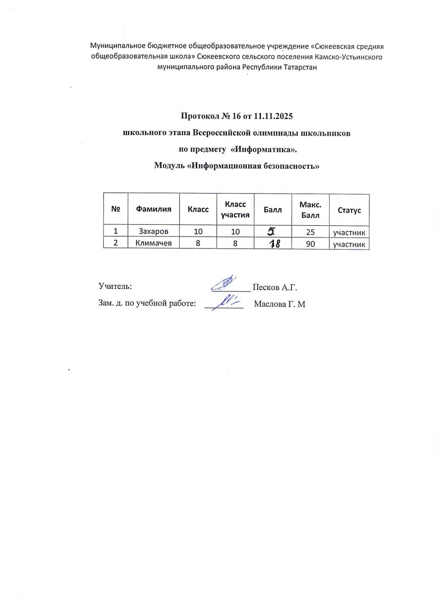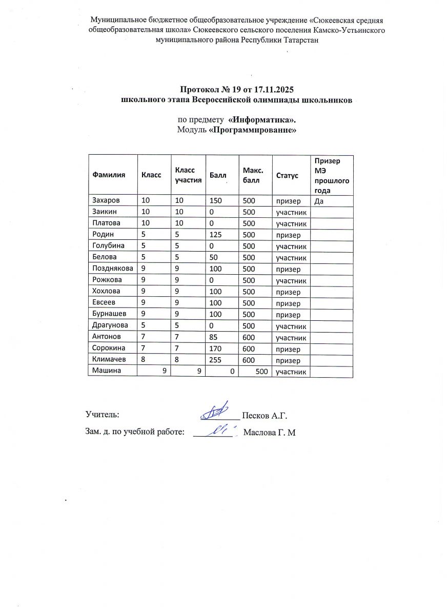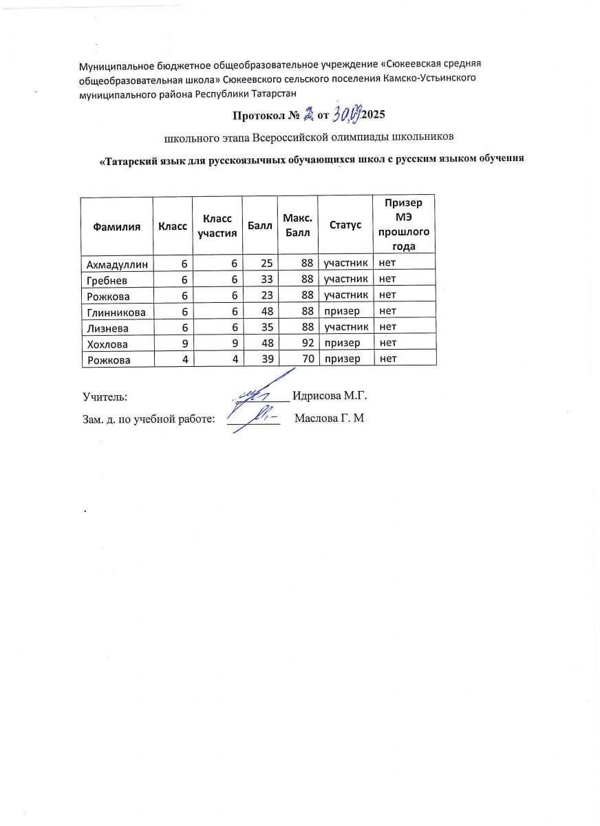 2) Протокол школьного этапа Республиканской олимпиады по предмету