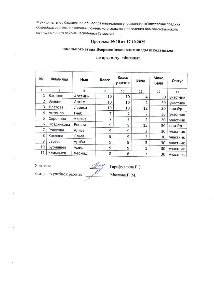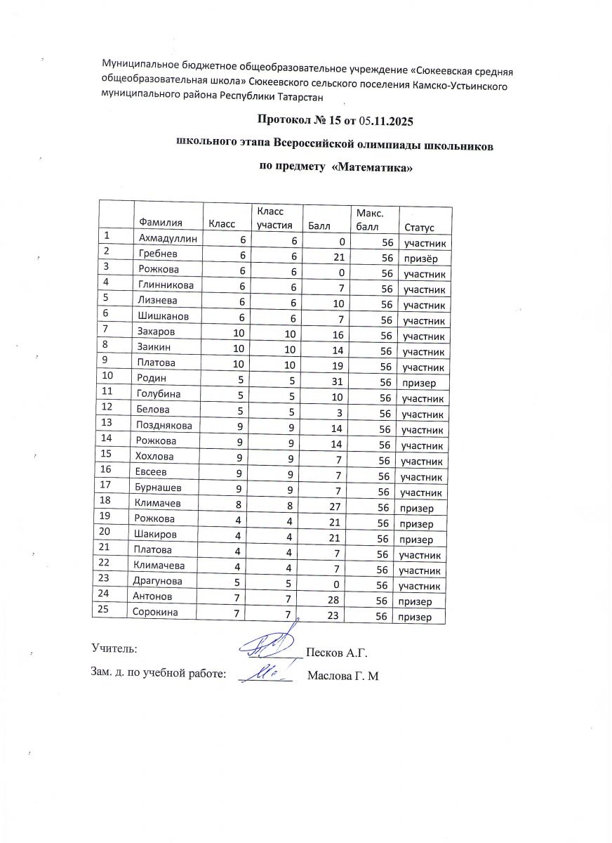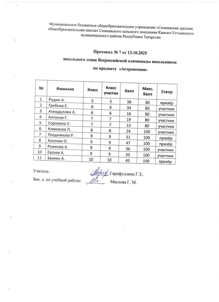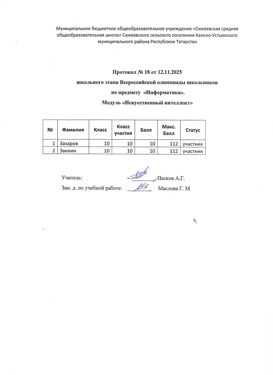 2) Протокол школьного этапа Республиканской олимпиады по предмету