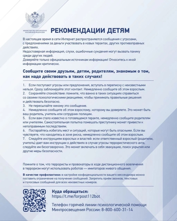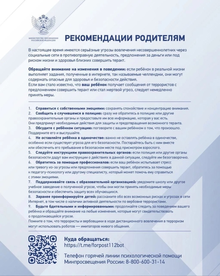 Информационные материалы Министерства просвещения для детей, родителей и педагогов по противодействию вовлечения несовершеннолетних в террористическую деятельность.