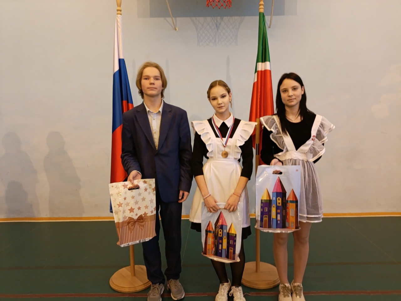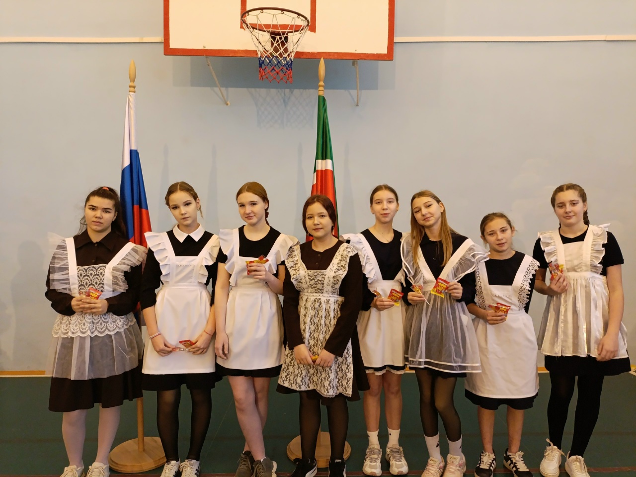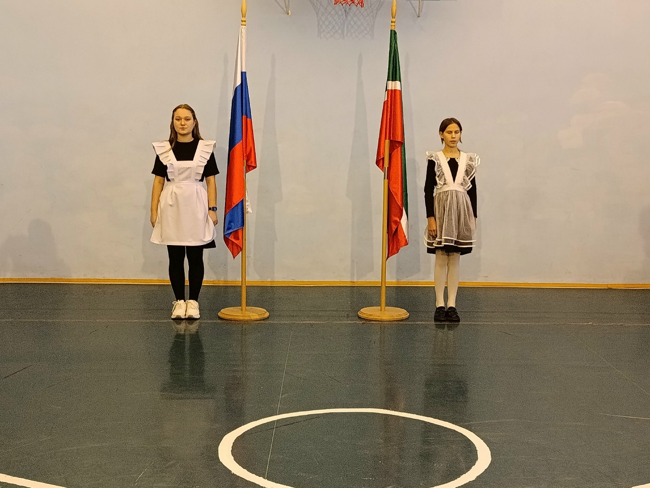 Традиционно понедельник в нашей школе начался с торжественной церемонии. Состоялся вынос Государственных флагов Российской Федерации и Республики Татарстан и исполнение гимнов.