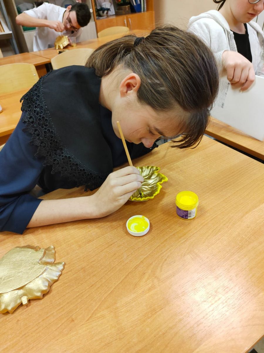 Под чутким руководством мастера Лилии Гумеровой ребята создали невероятно трогательные и красивые тарелочки «Кленовый лист». Каждый вложил в свою работу частичку души, ведь этот хрупкий, но такой прекрасный сувенир станет подарком самому дорогому человеку — маме — в преддверии Дня матери.