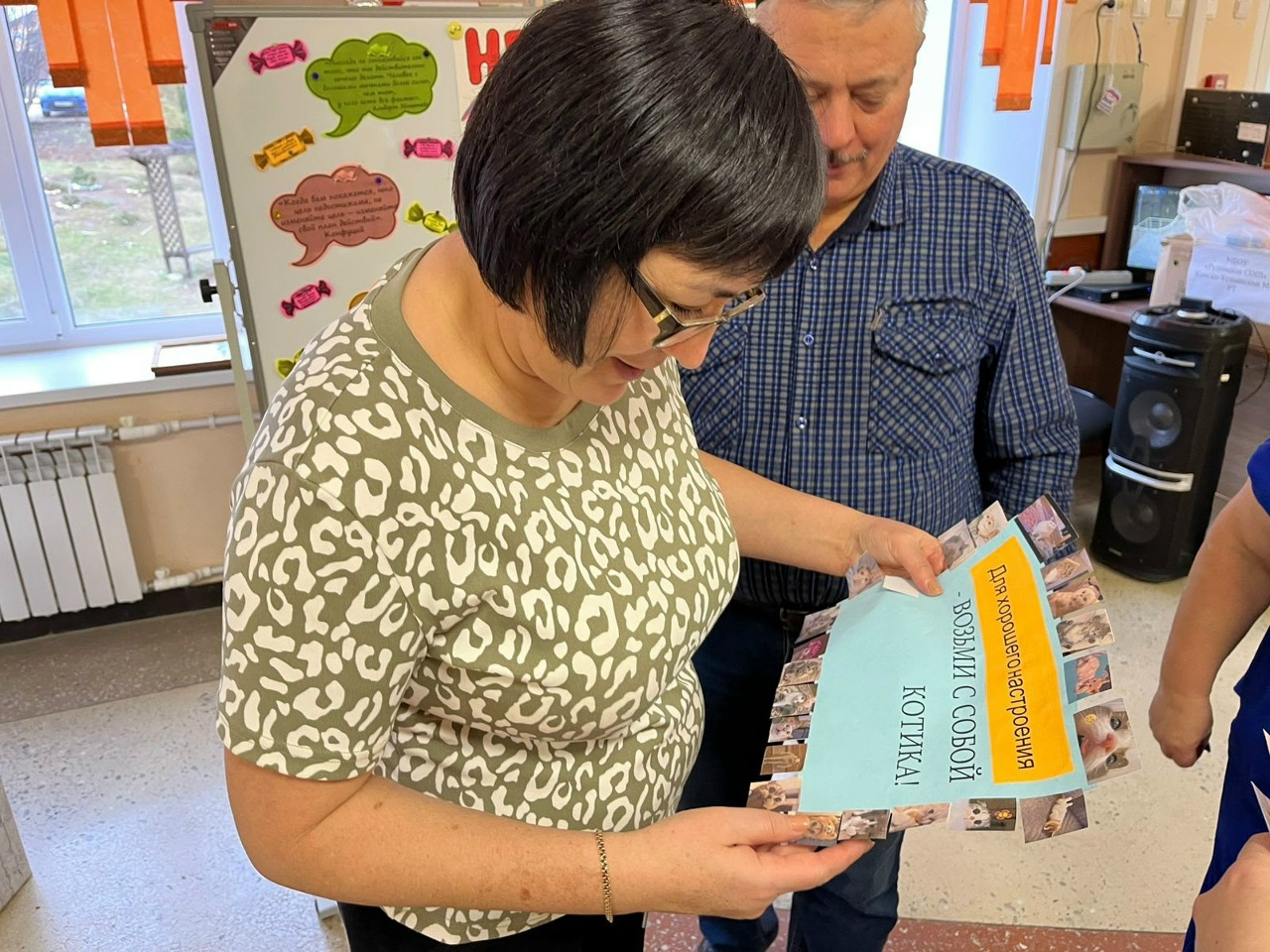 Педагог организатор вместе с советником приготовила листы с наклейками котиков, где было в центре листа написано: "Хорошее настроение- Возьми с собой котика». И тогда на процентов человек становился счастливее.