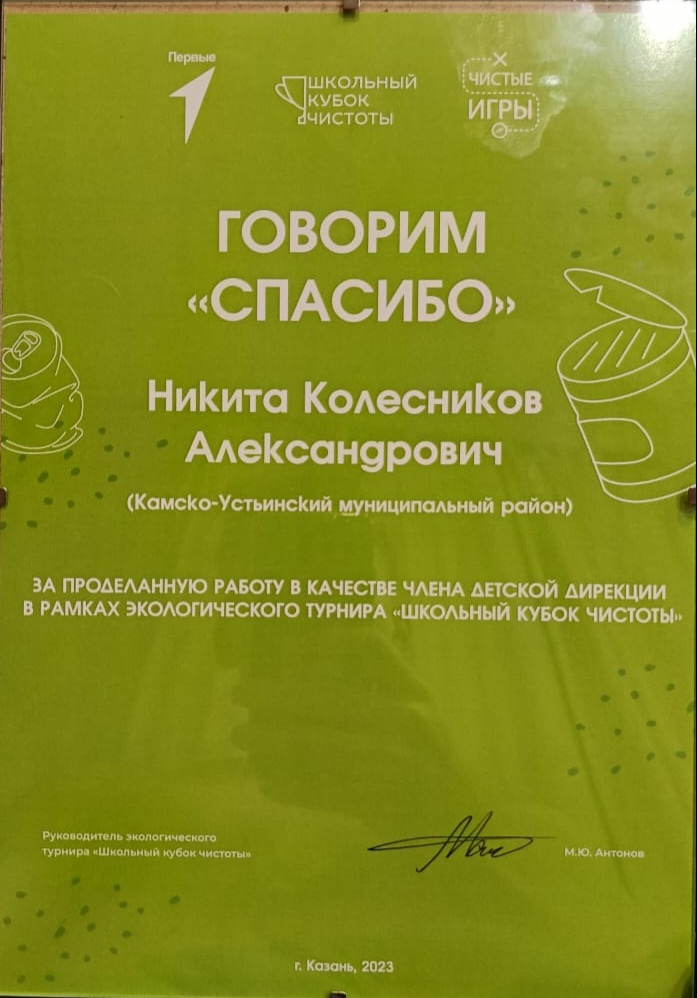 10 ноября 2023 года в технологическом парке "IT-парк им. Башира Рамеева" г. Казани прошёл финальный этап экологического турнира "Школьный кубок чистоты". В качестве спикера экологического квиза принял участие ученик нашей школы Колесников Н. За проведенную работу Никита награждён Благодарственным письмом "Движения первых". Поздравляем нашего активиста и желаем дальнейших успехов!