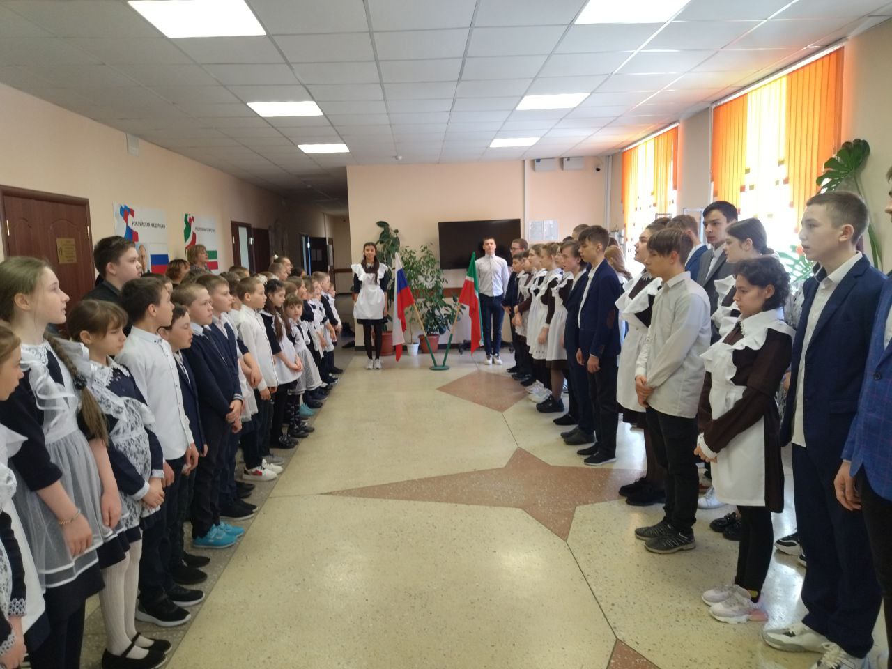 Четвертая четверть традиционно началась с общешкольной линейки, с выноса флагов и исполнения гимнов. Почетное право вынести флаг Российской Федерации и флаг Республики Татарстан на этой неделе было предоставлено победителям в Первенстве Камско - Устьинского района по бадминтону Мухамадуллиной К. и Зиновьеву Р.