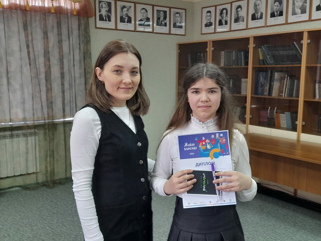 23 марта в районной библиотеке прошёл муниципальный этап Всероссийского конкурса юных чтецов «Живая классика - 2023."Живая классика" – самый масштабный в России проект по популяризации чтения среди детей, его главная задача – воспитать в подростках любовь к художественной литературе.Жюри конкурса учитывало не только выразительность чтения, грамотную речь и умелый выбор текста произведений, но и артистизм исполнения, глубину проникновения в образную систему и смысловую структуру текста.В данном конкурсе от нашей школы приняли участие Шайхайдарова А, ученица 5 класса, Рвачева К. и Шуктомов А., ученики 8 класса. Все они достойно выступили. Они донесли до слушателей всю глубину таких нравственных понятий, как доброта, милосердие, сострадание и свое отношение к окружающему миру.Победителем конкурса стал Шуктомов А. (руководитель -Гайнуллина Л.С.) От всей души поздравляем Алтая и Лилию Сафаргалиевну с победой. Желаем им творческих успехов на следующем этапе данного конкурса.