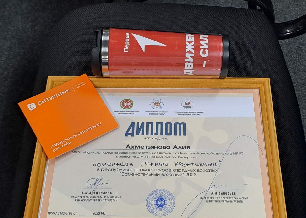 29 марта 2023 года в Казани на базе Исторического парка «Россия – моя история» состоялся финал Республиканского конкурса отрядных вожатых «Замечательный вожатый-2023». Ученица нашей школы Ахметзянова А. (руководитель Миннизянова Л. В) достойно прошла все этапы конкурса и стала победителем в номинации "Самый креативный".Финал конкурса предполагал визитку «Расскажи нам о себе», игру «Интерактив с залом», а также решение педагогических кейсов в игре «Я не волшебник, я только учусь». Преодолевая препятствия, Алия показала свои творческие, организаторские способности, умение находить решение в проблемной ситуации и оригинальность мышления.Поздравляем Алию с победой и желаем ей творческих успехов и дальнейших побед.