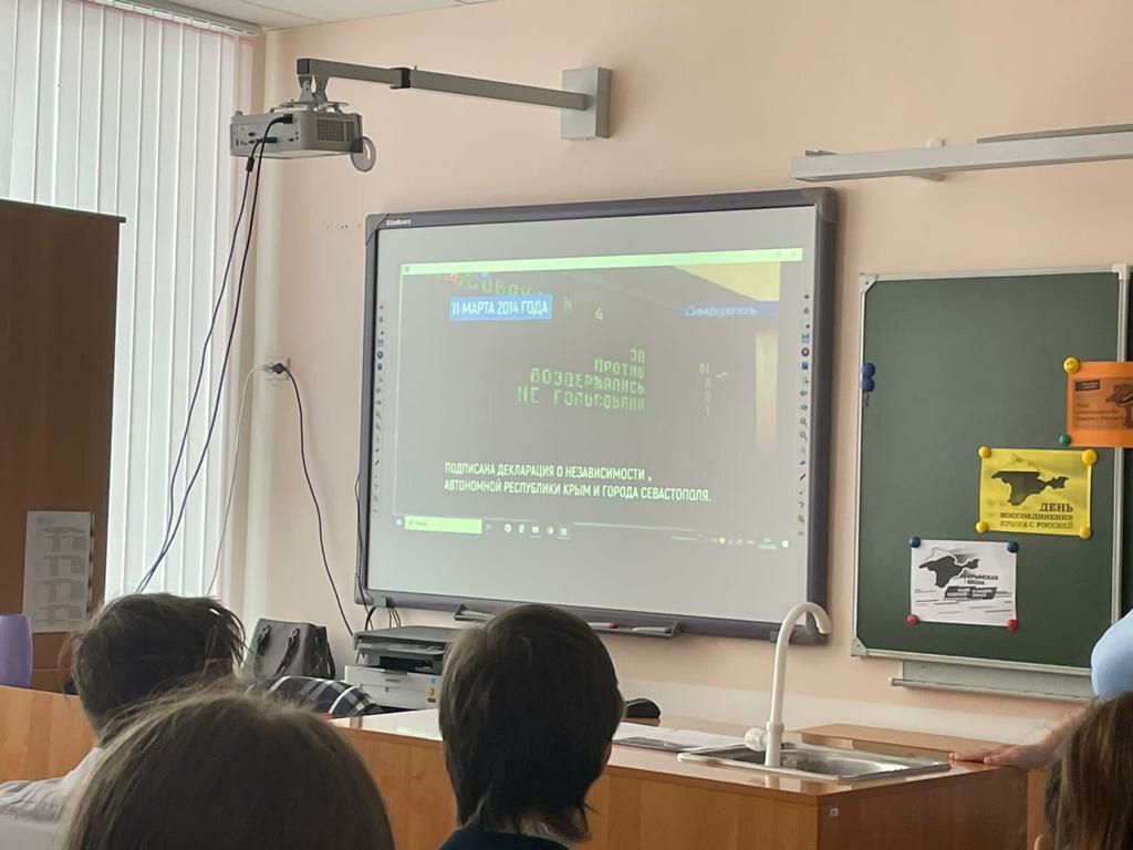 20 марта в 8-9 классах прошло занятие курса внеурочной деятельности «Разговоры о важном» на тему «День воссоединения Крыма с Россией». Обучающиеся узнали об исторических событиях, связанных с воссоединением русского Крыма с Россией. Обсуждались причины и значение воссоединения России и Крыма, понятие «Русская весна». Небольшой исторический экскурс показал ребятам, что Крым – это исконно русская территория, олицетворение русской боевой славы и его возвращение – это восстановление исторической справедливости. Обучающиеся также узнали о развитии Крыма за последние 9 лет: масштабном строительстве жилых объектов и инфраструктуры, восстановлении исторических памятников, реконструкции и строительстве в Международном детском центре «Артек» и др. Завершились занятия просмотром видеоролика «Крым в сердце каждого из нас».