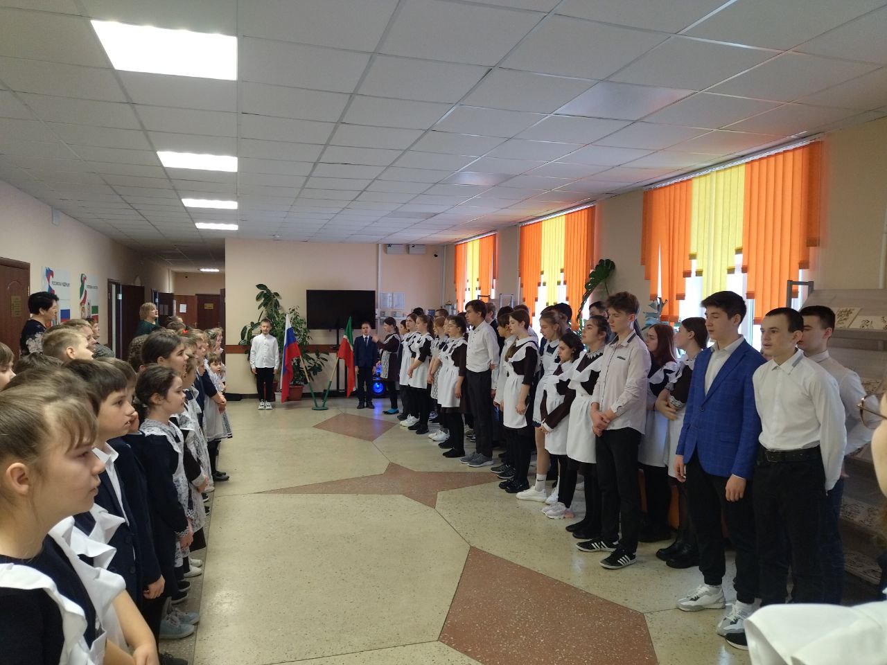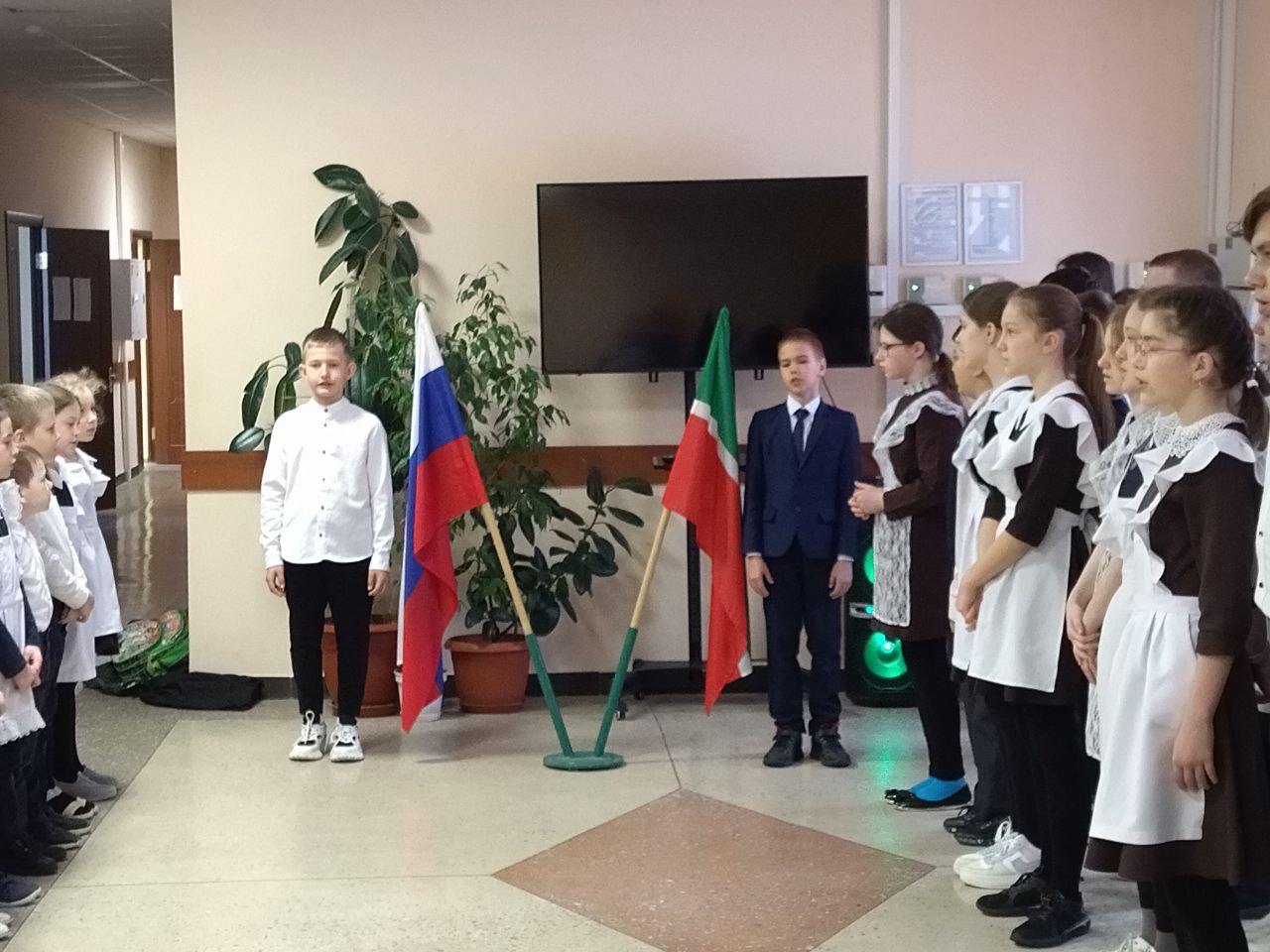 Учебная неделя в школе началась с выноса флагов и исполнения гимнов. Почетное право вынести флаг Российской Федерации и флаг Республики Татарстан на этой неделе было предоставлено многократным победителям конкурсов рисунков и поделок разной направленности ученику 2 класса Гурьянову Даниилу и ученику 3 класса Мокшину Арсению.