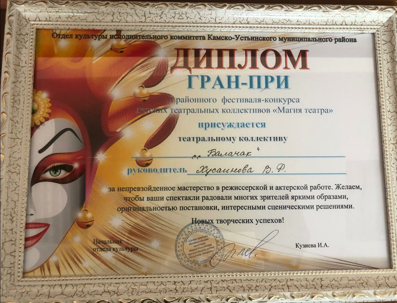 12 марта в Доме культуры с. Теньки прошёл районный фестиваль-конкурс детских театральных коллективов "Магия театра". Школьный театр "Балачак" под руководством учителя татарского языка и литературы Хусаиновой В. Р. выступил успешно. Ученица 8 класса Ахметзянова А. прочитала монолог из спектакля 'Сүнгән йолдызлар".Поздравляем Алию и Венеру Рустамовну с Гран -при и желаем им дальнейших успехов.