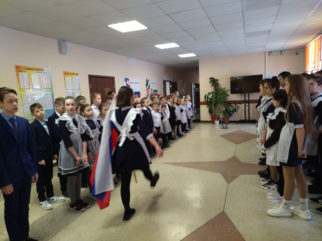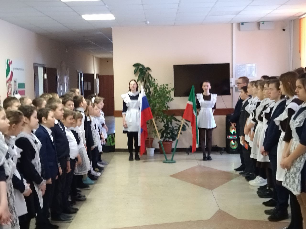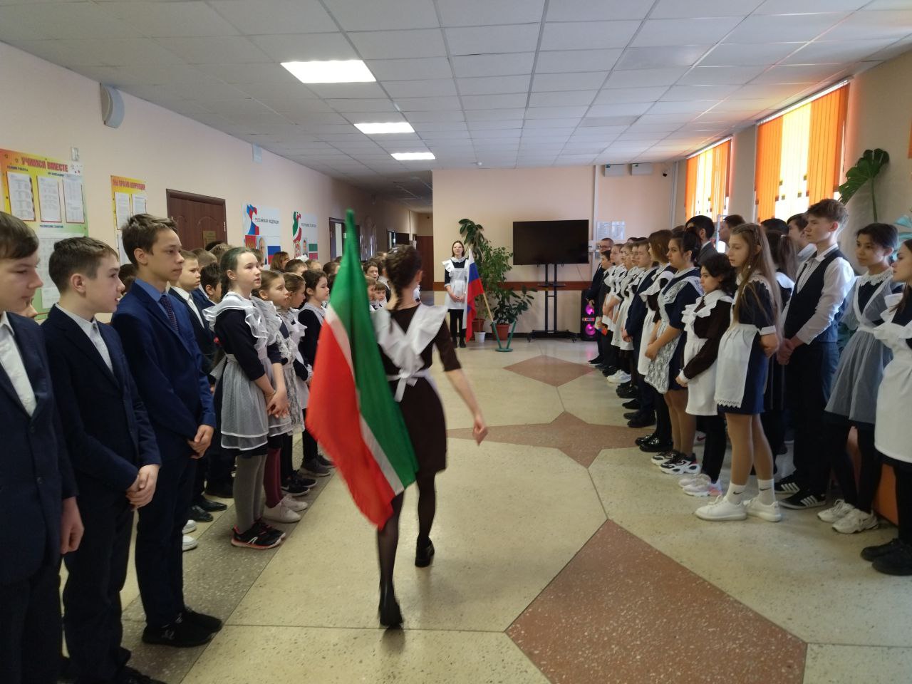 Торжественная линейка, посвященная началу новой трудовой недели!Почетное право вынести флаг Российской Федерации и флаг Республики Татарстан предоставлено лучшим командирам отрядов Муллагалеевой А. и Агафоновой А.