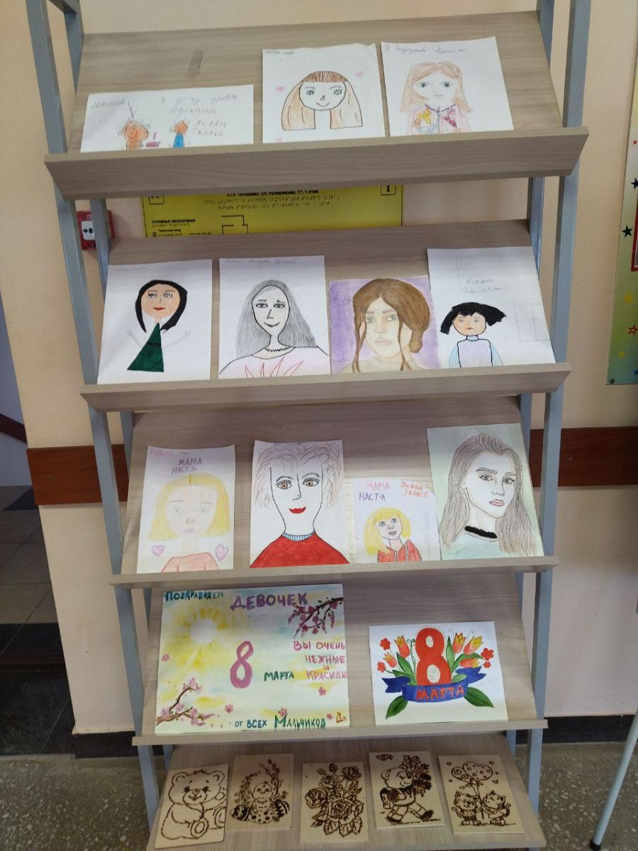 В нашей школе с приходом весны первая неделя марта посвящается Международному женскому дню 8 Марта. Ребята готовятся к традиционному концерту для мам и бабушек, провели конкурс рисунков на лучший портрет «Наши мамочки!», приготовили своими руками подарки мамам – выжигали рисунки.Восьмое марта – день особенный,День радости и красоты.На всей земле он дарит женщинамСвои улыбки и цветы!