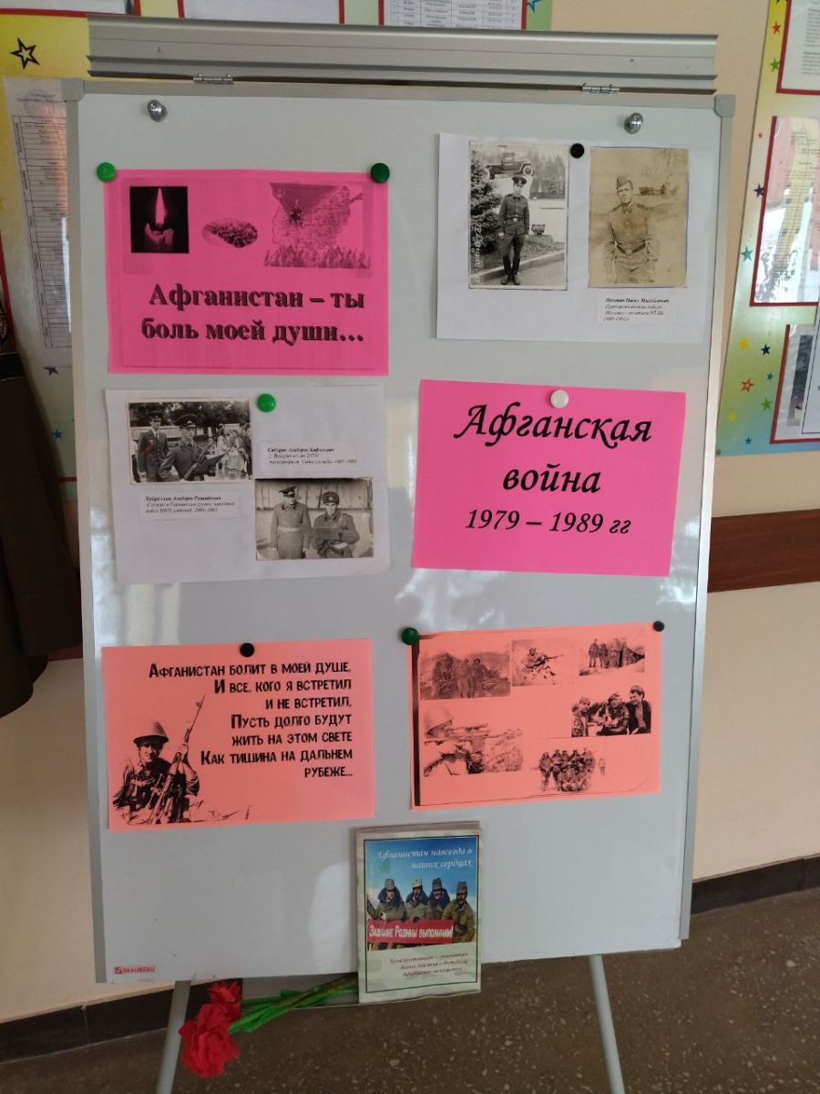 Сегодняшний школьный день начался с песен, которые звучали по радиоузлу, дети и учителя, входившие в здание школы, увидели стенд, информирующий, что 15 февраля 1989 года советские войска были выведены и Афганистана.Афганская война, одна из самых долгих и трагических войн второй половины 20-го века, закончилась. Весь день во время перемен звучали стихи, песни, посвящённые этому событию, в память павших солдат была зажжена свеча.