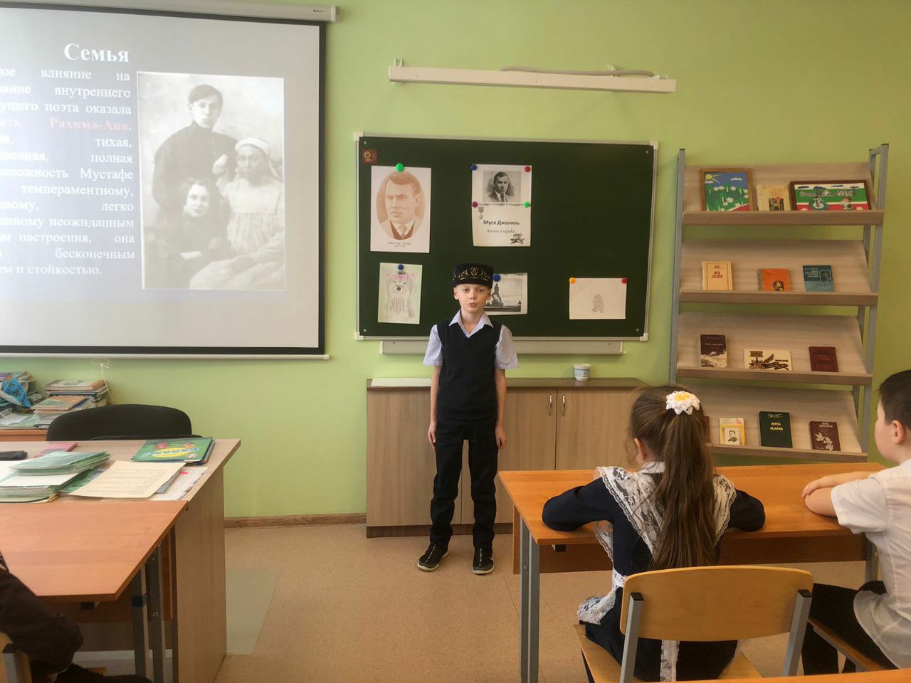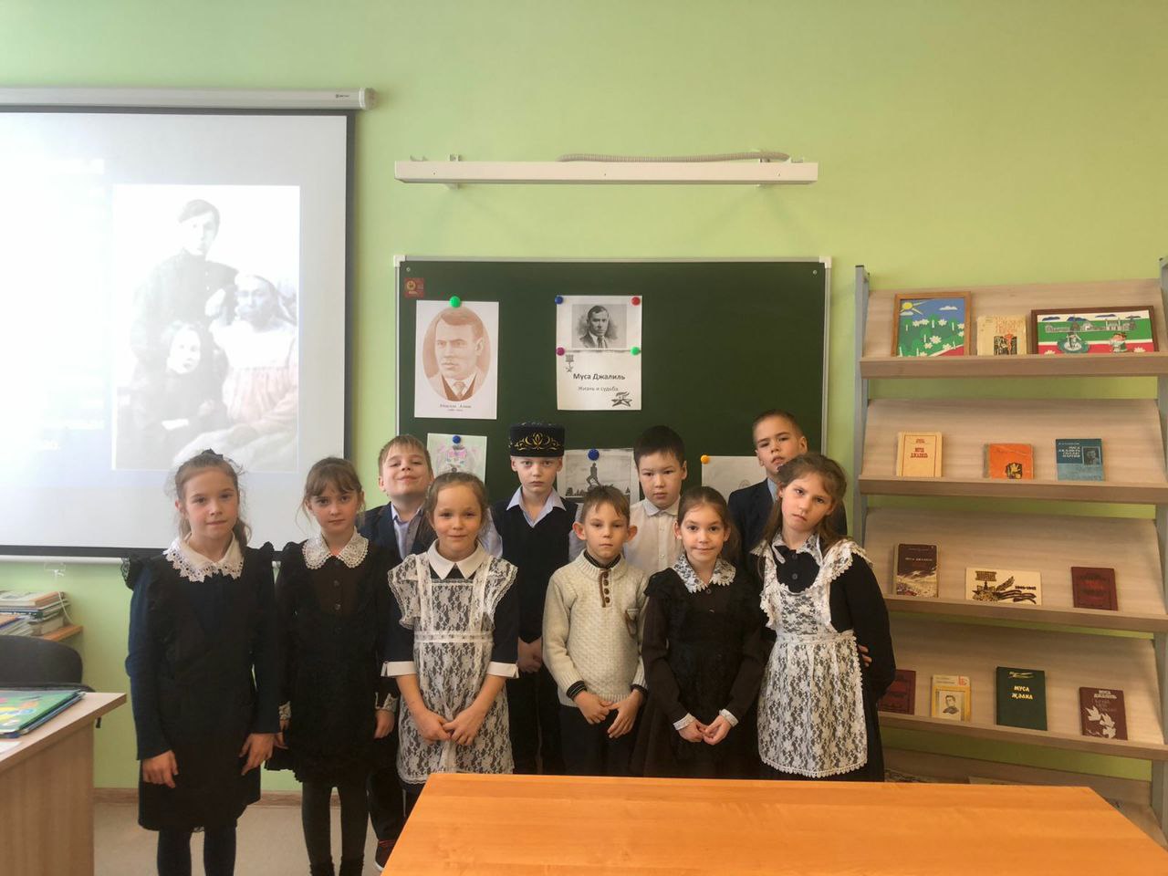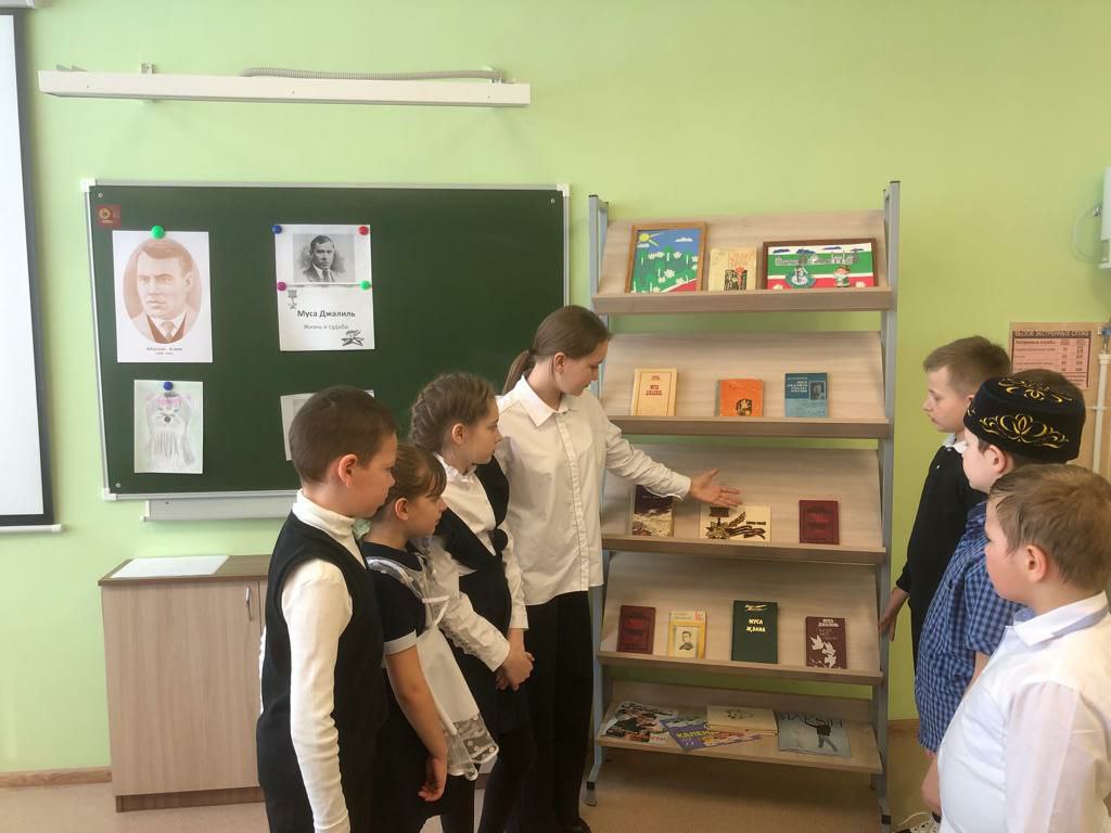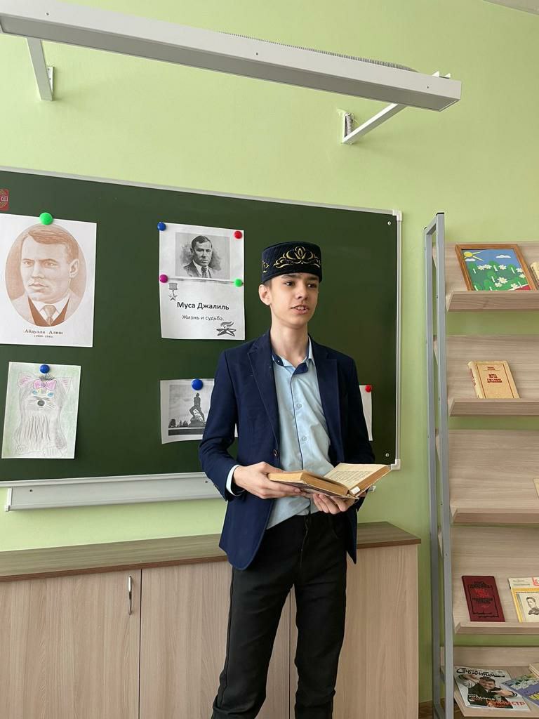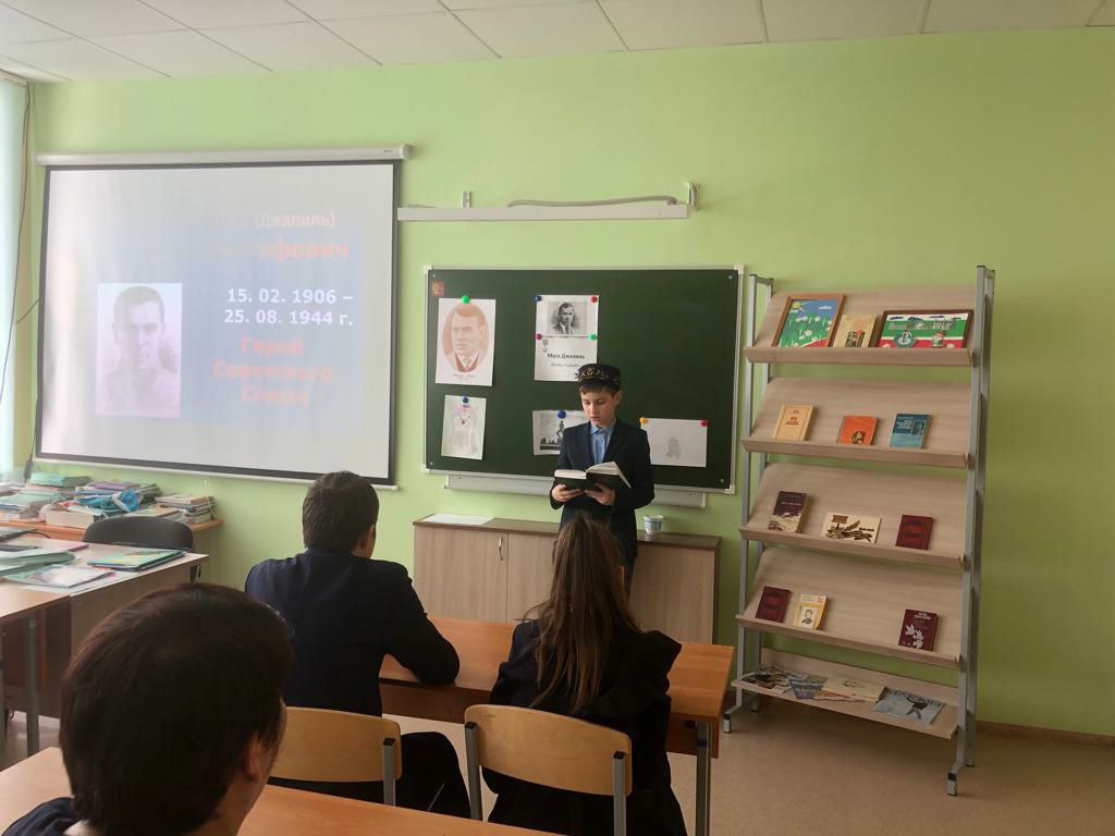 В рамках месячника гражданско- патриотического воспитания в нашей школе прошёл урок мужества, посвящённый 117 - летию со дня рождения татарского поэта -героя Мусы Джалиля. В ходе мероприятия учитель истории Тагирова М. Г. и учитель татарского языка Хусаинова В. Р. рассказали об интересных фактах из жизни поэта, литературной деятельности, о героических страницах жизни в годы Великой Отечественной войны.И, конечно, ребят не оставило равнодушным знакомство с циклом «Моабитская тетрадь». Ученики просмотрели презентацию о малоизвестных фактах из жизни поэта, а также о памятных местах, связанных с именем поэта- героя. В заключение прозвучали стихи «Мои песни», «Красная ромашка», «Яулык», «Бер шигырь». Стихи Джалиля живы и будут жить вечно, пока мы их читаем.