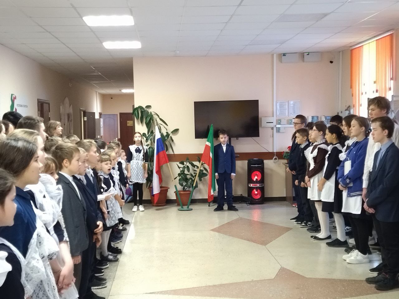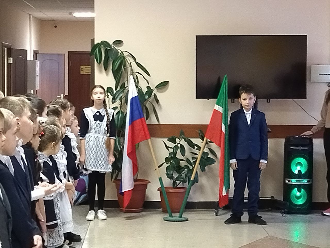 Почетное право выноса флага Российской Федерации и флага Республики Татарстан на этой неделе было предоставлено победителям Республиканского конкурса "Школьный Экопатруль" Гайнутдинову И. и Зиновьевой А.
