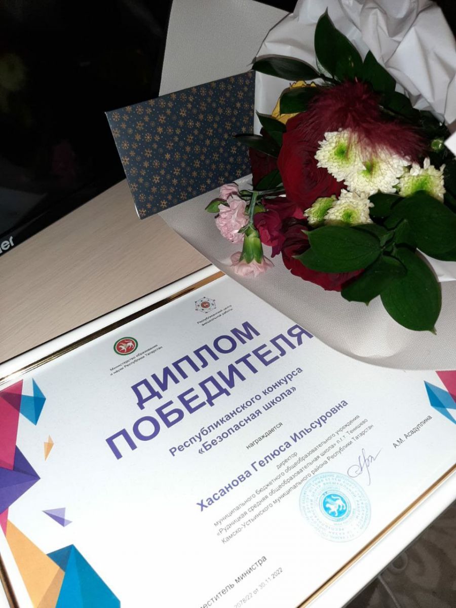 Ура!!! Еще одна победа в копилку школы.2 декабря в Казанском государственном институте культуры состоялась церемония награждения победителей республиканского конкурса "Безопасная школа". Директор нашей школы, Хасанова Г. И., стала победителем данного конкурса. Гелюся Ильсуровна награждена Дипломом Министерства образования и науки РТ и денежным сертификатом. От всей души поздравляем Гелюсу Ильсуровну!!! Желаем дальнейших творческих успехов!!!