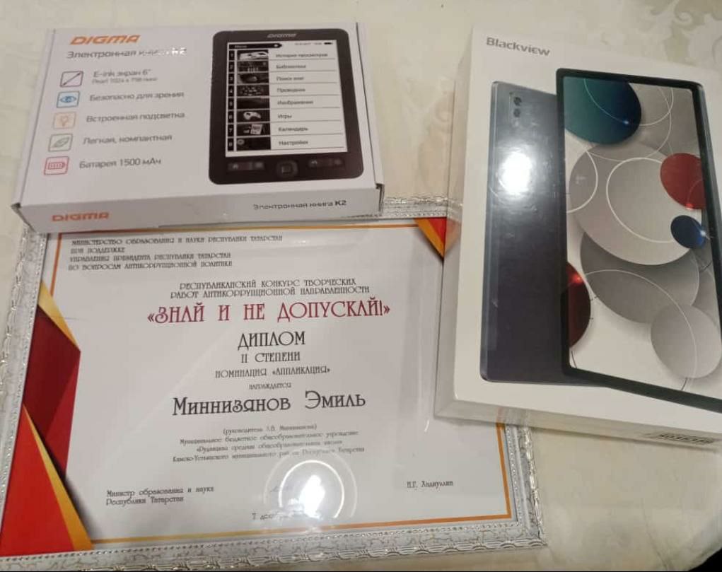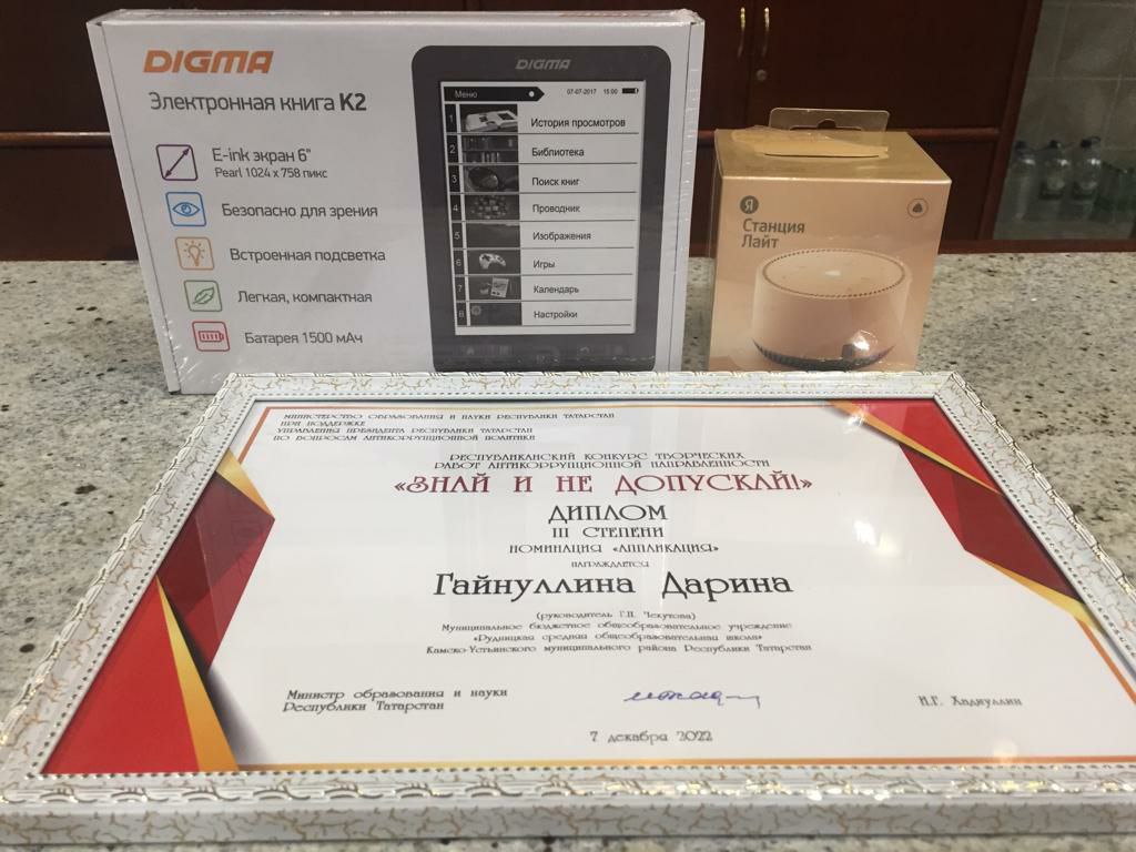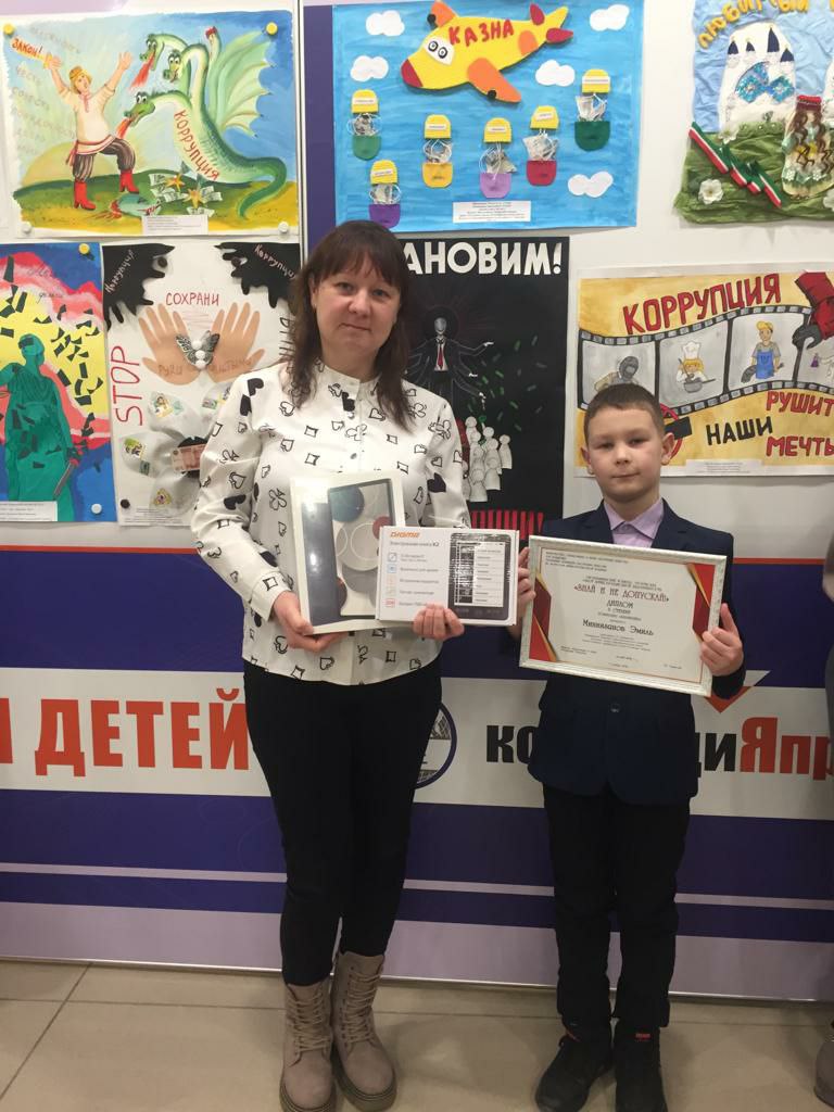 7 декабря 2022 года в Казанском Кремле состоялась церемония награждения школьников, участвовавших в республиканском творческом конкурсе на антикоррупционную тематику.В церемонии награждения от МБОУ «Рудницкая СОШ» участвовали Гайнуллина Д. , ученица 1 класса (руководитель Чекутова Г. Н. ) и Миннизянов Э., ученик 3 класса (руководитель Миннизянова Л. В.). Миннизянов Э. занял 2 место, а самая юная наша участница, Гайнуллина Дарина, заняла 3 место. Учащиеся награждены Дипломами и ценными призами (умными Яндекс-колонками «Алиса»,электронными книгами и планшетом).От всей души поздравляем наших ребят и их руководителей! Желаем творческих успехов и новых побед.