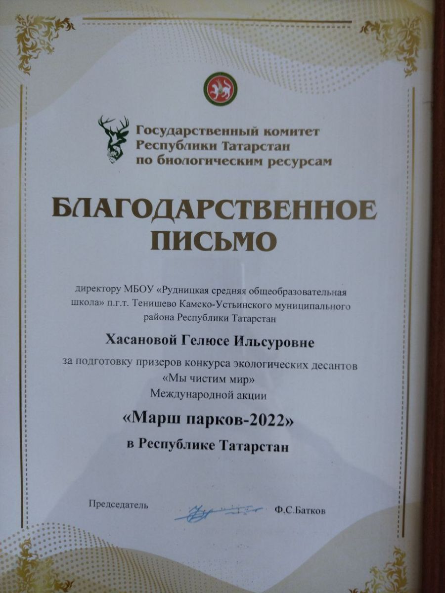 Парад талантов21 октября учащиеся и педагоги нашей школы были награждены грамотами и благодарственными письмами от Государственного комитета Республики Татарстан по биологическим ресурсам и заказника "Долгая Поляна" за победу и подготовку призеров конкурса экологических десантов "Мы чистим мир" Международной акции "Марш парков -2022". Поздравляем всех с победой и желаем дальнейших творческих успехов!