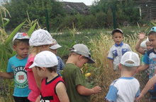 Дети рассматривают выращенный урожай.