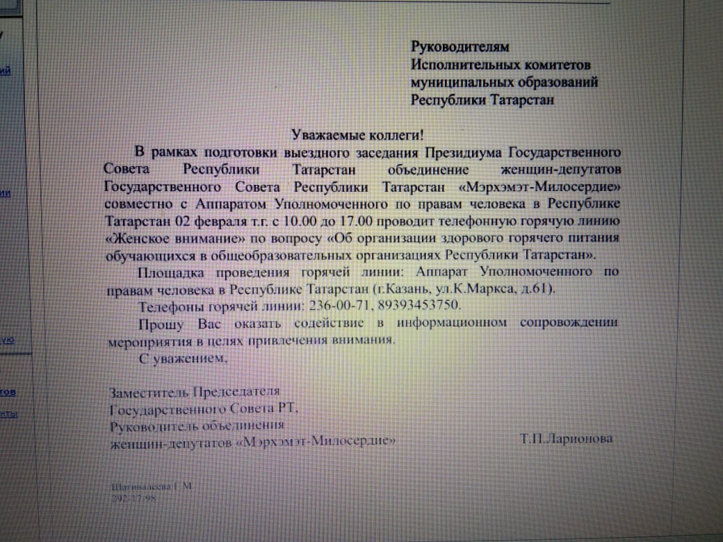 В рамках подготовки выездного заседания Президиума Государственного Совета Республики Татарстан объединение женщин-депутатов Государственного Совета Республики Татарстан «Мэрхэмэт-Милосердие» совместно с Аппаратом Уполномоченного по правам человека в Республике Татарстан 02 февраля т.г. с 10.00 до 17.00 проводит телефонную горячую линию «Женское внимание» по вопросу «Об организации здорового горячего питания обучающихся в общеобразовательных организациях Республики Татарстан».