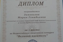 1 место во Всероссийском творческом конкурсе «Великий писатель» заняла Зиновьева Мария.