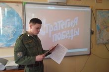В преддверии 70-летия Великой Победы в 9 классах Кадетской школы под руководством воспитателя Иютина В.Н.. был проведён классный час по теме «Стратегия Победы!» Одна из самых важных причин победы – это «сплочённость советского общества в борьбе с врагом. Выдержала испытание и дружба народов СССР.