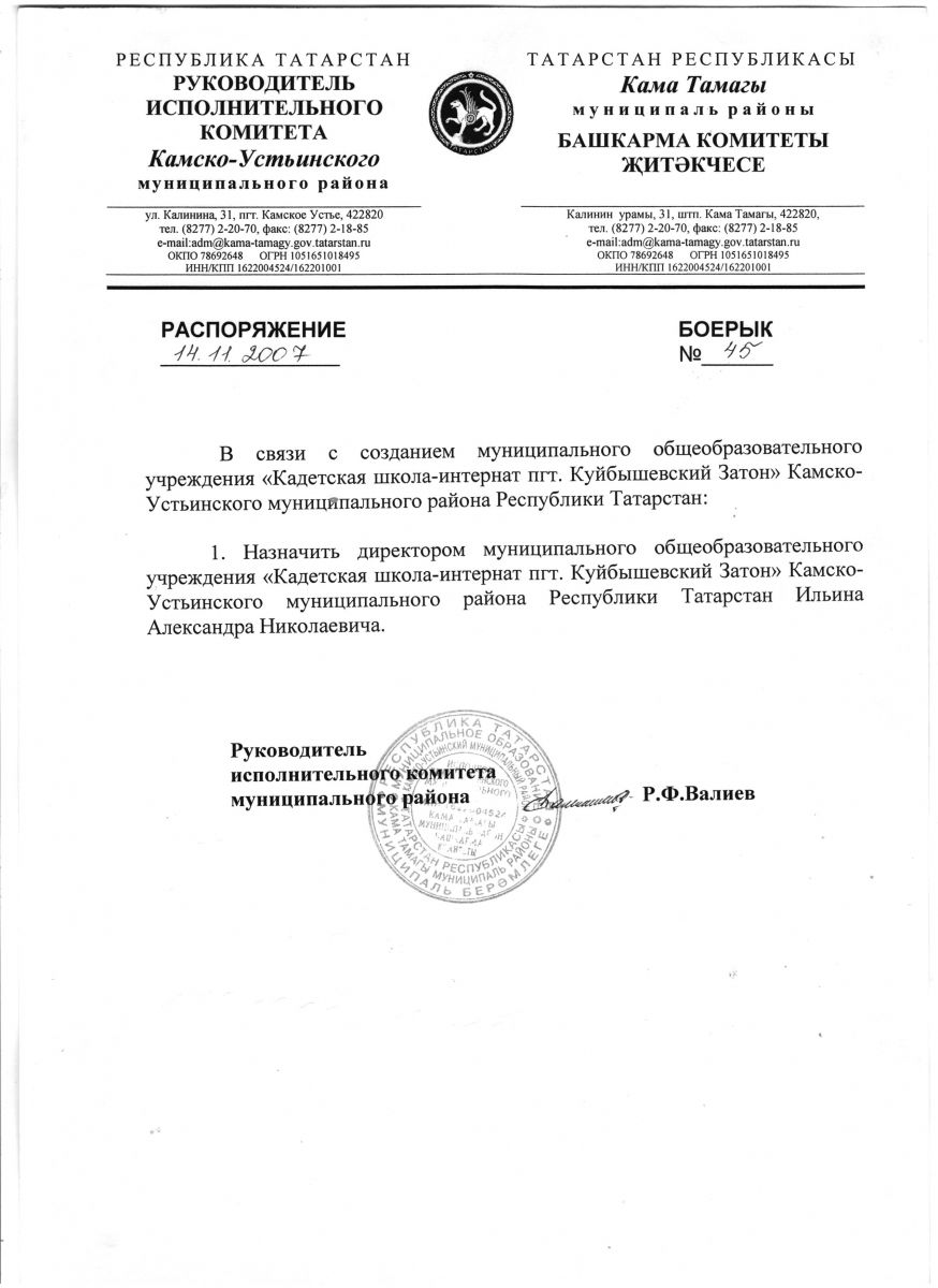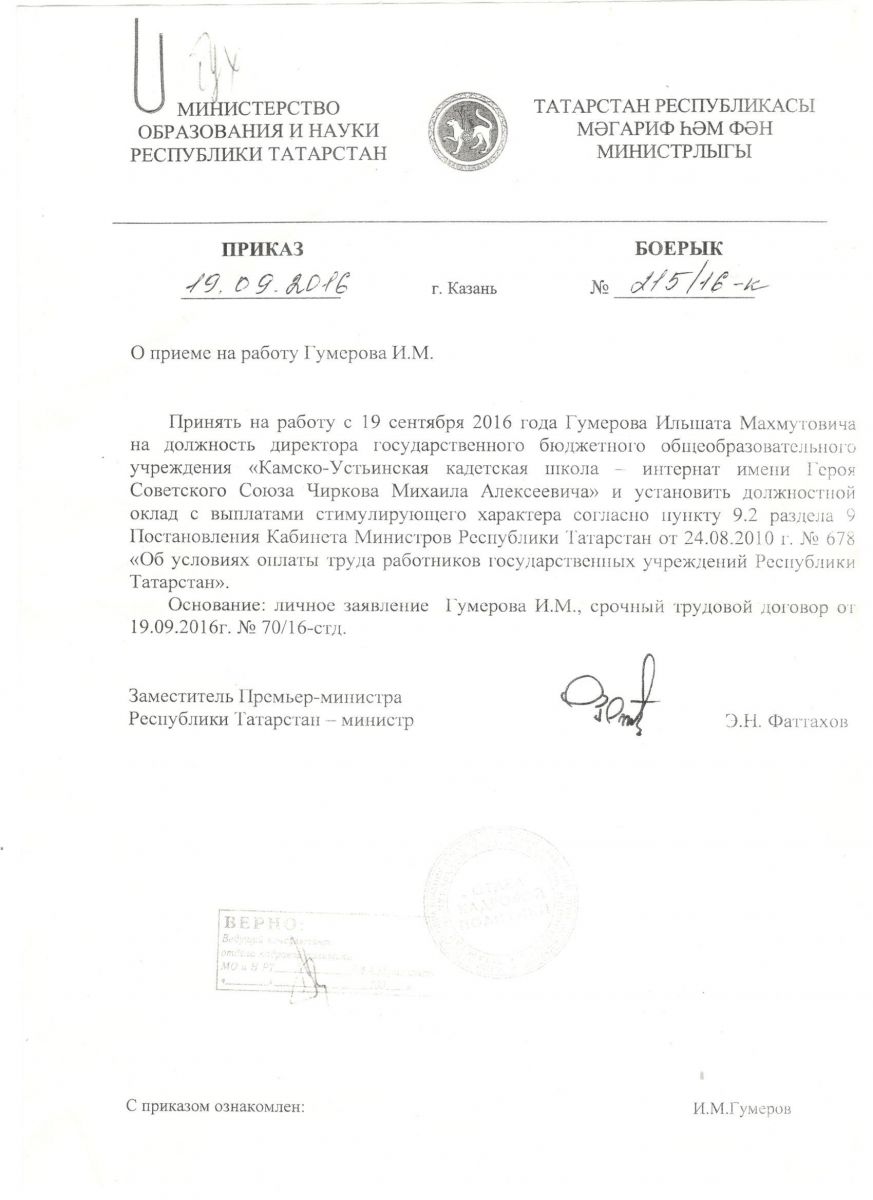 С 19 сентября 2016 года на должность директора государственного бюджетного общеобразовательного учреждения "Камско-Устьинская кадетская школа-интернат имени Героя Советского Союза Чиркова Михаила Алексеевича" назначен Гумеров Ильшат Махмутович.