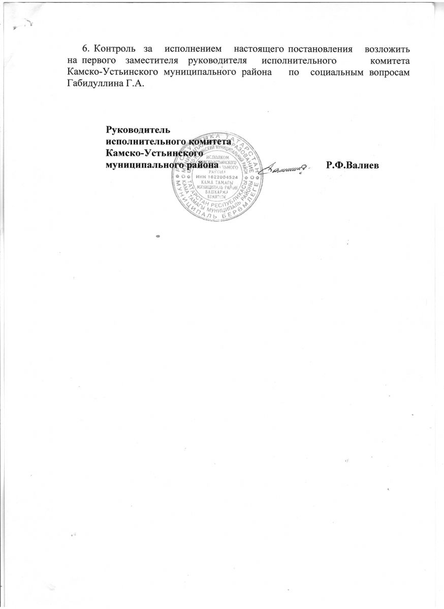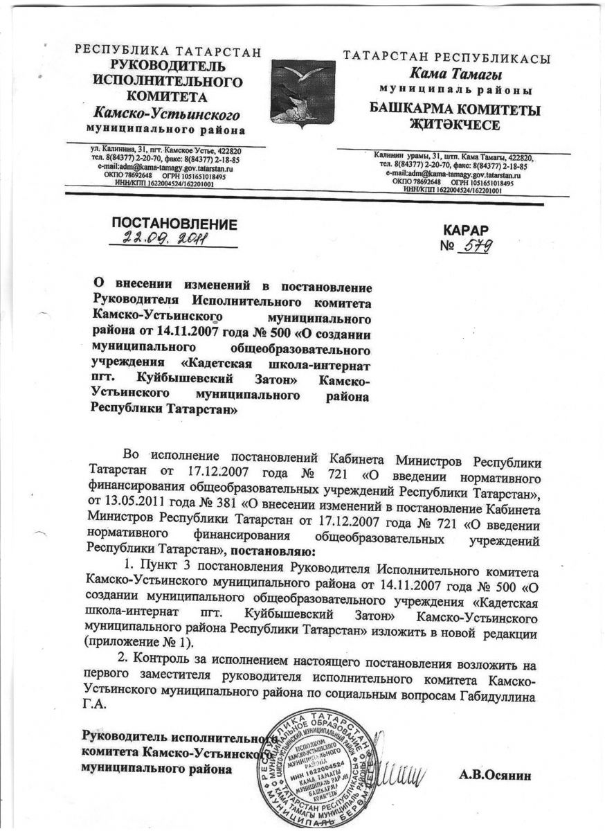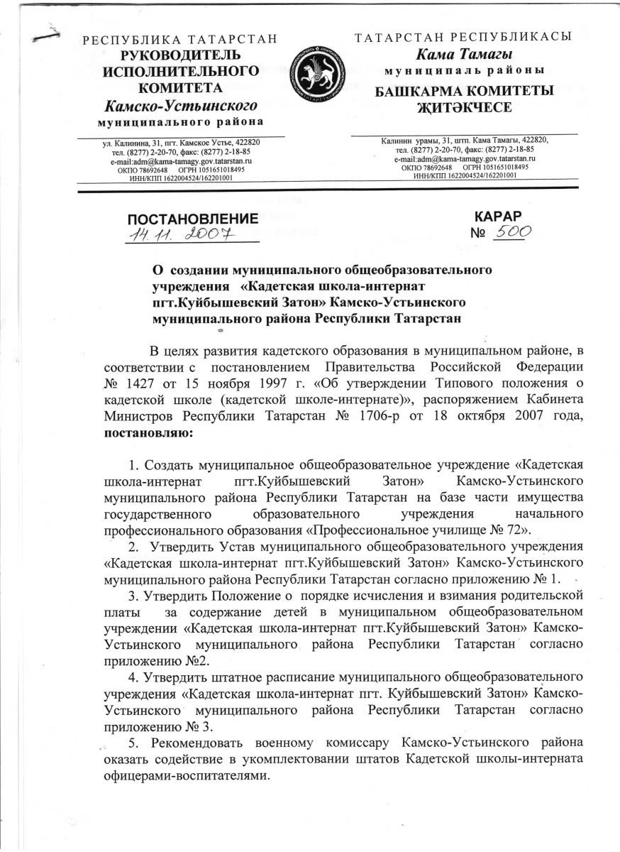 Постановление о создании муниципального общеобразовательного учреждения "Кадетская школа-интернат п.г.т. Куйбышевский Затон" Камско-Устьинского МР РТ лист1, лист 2